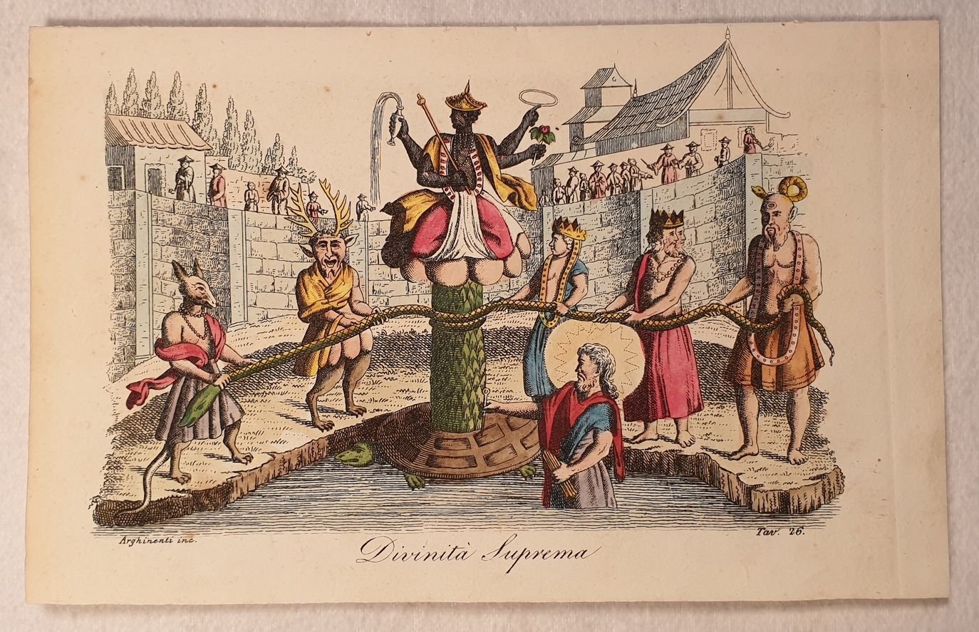 Planche del 1824 colorata a mano che rappresenta il Dio induista Brama. Autore: Giulio Ferrario (1767-1847) Atlante: Il costume antico e moderno o storia del governo – Firenze, Vincenzo Batelli e Compagni Data: 1824 Tecnica: incisione su rame colorata a mano Dimensione del foglio: 20,5x13 cm Dimensione incisione: 19x11,5 cm Condizioni: Buone. Alcune fioriture. Print of 1824 coloured by hand representing the Hindu God Brama. Author: Arghinenti - Giulio Ferrario (1767-1847) Atlas: Il costume antico e moderno o storia del governo – Firenze, Vincenzo Batelli e Compagni Date: 1824 Technique: Copper etching coloured by hand Page Dimension: 20,5x13 cm (8.1x5.1 inches) Engraving Dimension: 19x11,5 cm (7.5x4.5 inches) Conditions: Good conditions. Occasional foxings.