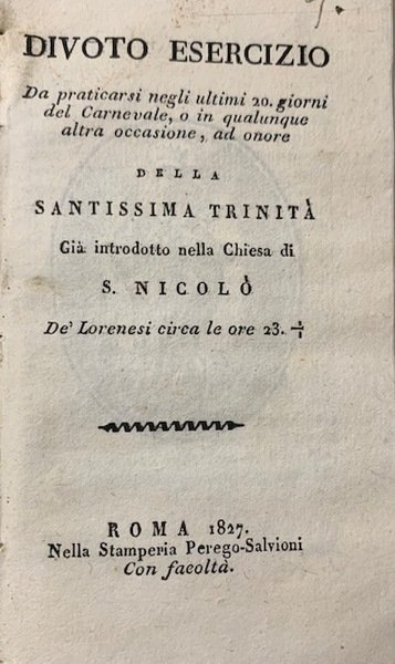 Divoto esercizio da praticarsi negli ultimi 20. giorni del Carnevale, o in qualunque altra occasione, ad onore della Santissima Trinità Già introdotto nella Chiesa di S. Nicolò de Lorenesi circa le ore 23.