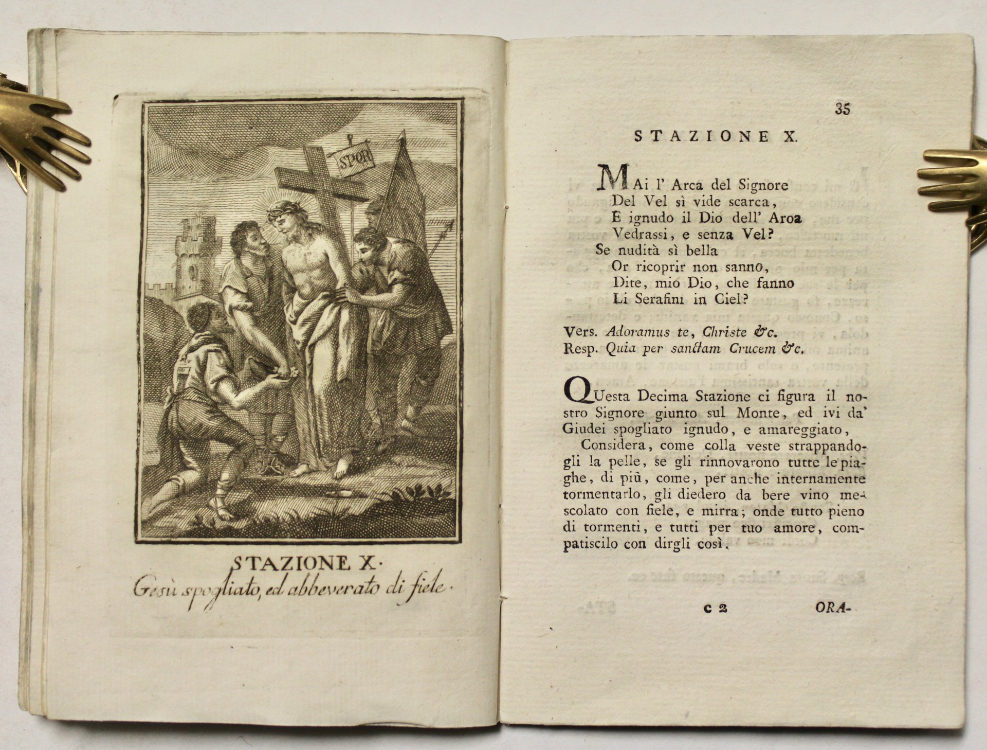 In 12° (mm 174x120); in cartoncino marezzato, pagg. (1 frontespizio inciso finemente in rame), 51. XIIII tavv. calcografiche che raffigurano la Via Crucis, una per ogni stazione. Bell'esemplare su carta vergellata. <BR><BR>