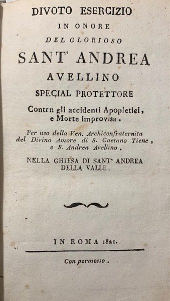 Divoto esercizio in onore del glorioso Sant'Andrea Avellino special protettore, conto gli accidenti Apopletici e Morte Improvvisa. Per uso della Ven. Archiconfraternita del Divino Amore di S. Gaetano Tiene, e S. Andrea Avellino, nella Chiesa di
