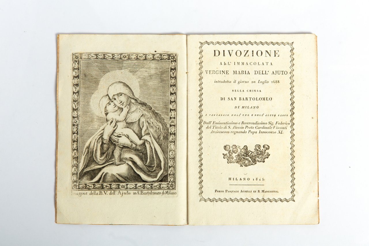 Divozione all'immacolata vergine Maria dell'Aiuto introdotta il giorno 20 luglio 1688 nella chiesa di San Bartolomeo di Milano a vantaggio dell'uno e dell'altro sesso dall'eminentissimo e reverendissimo sig. Federico del titolo di S. Alessio prete cardinale Visconti arcivescovo.