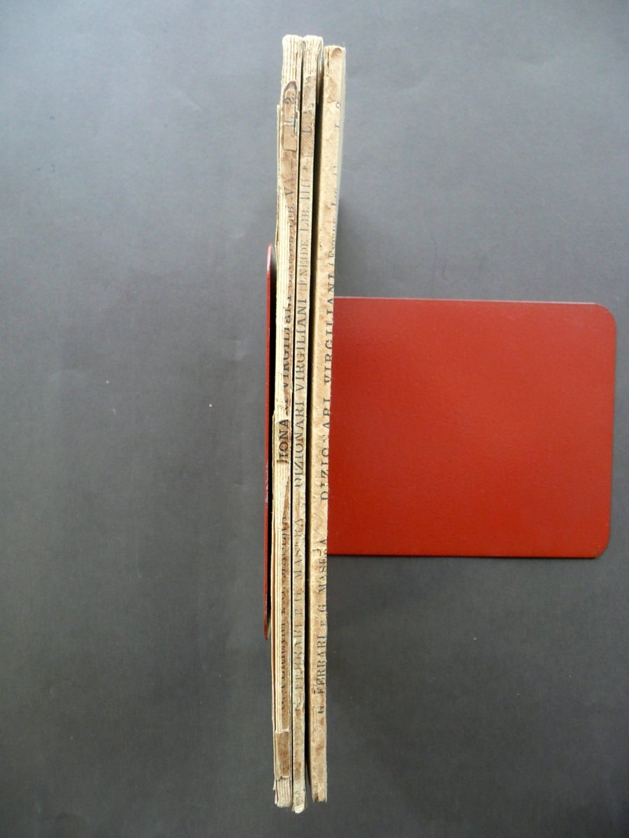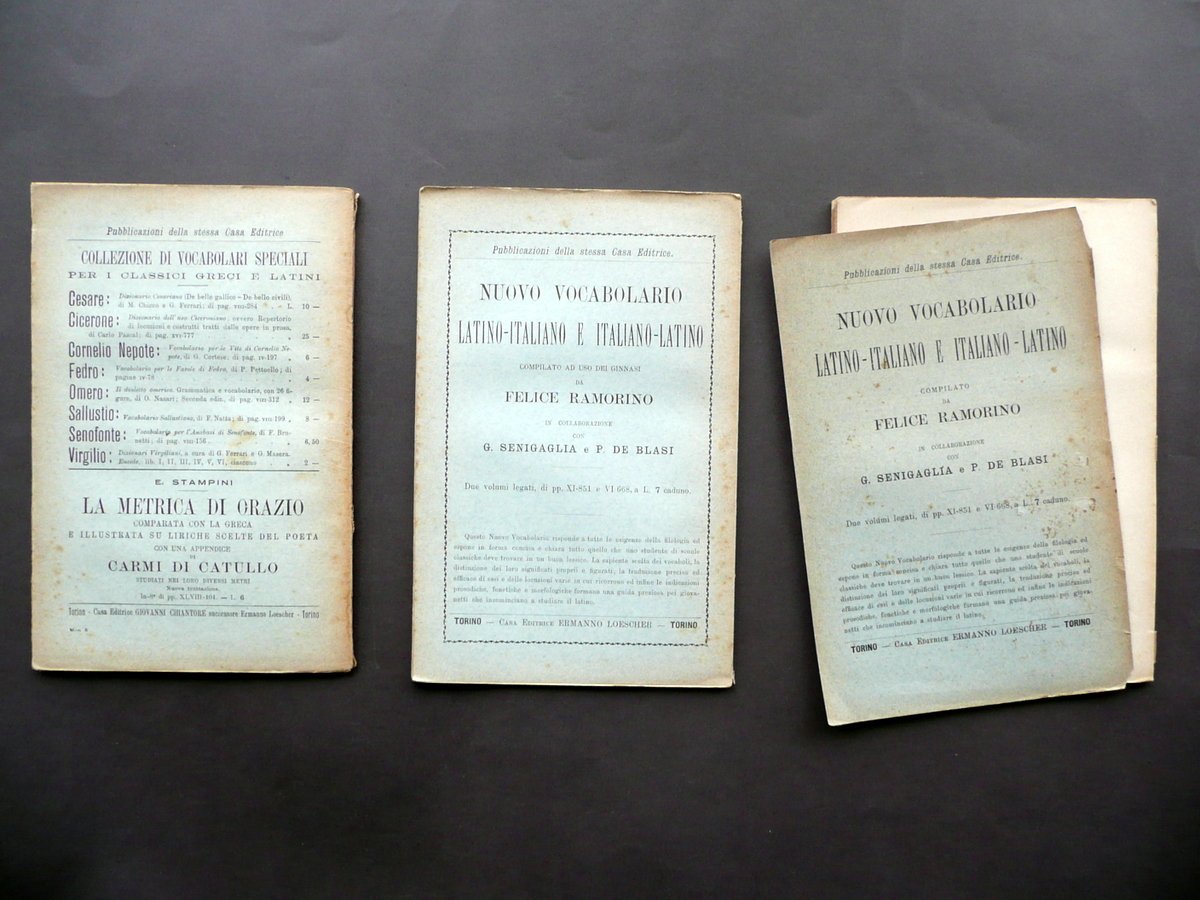 G. Ferrari e G. Masera, Collezione di vocabolari speciali per i classici greci e latini - Dizionari Virgiliani (Eneide, libri I - III - V) Tre fascicoli completi Loescher - Chiantore (succ. Loescher), Torino 1909-1911-1923; cm 21x13,5, pp. IV; 56 (Eneide - libro I); pp. VIII; 56 (Eneide - libro III); pp. VI; 82 (Eneide - libro V); brossura ed. Tre fascicoli completi. Condizioni di conservazione Esemplari tutti e tre complessivamente ben conservati con tracce d'uso, brossure con alcune minime bruniture e leggeri accenni d'ingiallimento ai margini e al dorso; fascicolo dedicato al libro V dell'Eneide con varie mancanze e fessurazioni al dorso, con conseguente distacco della brossura post. dal corpo del testo e allentamento delle cuciture (vedi foto). Interni buoni con lievi accenni d'ingiallimento dovuti al tipo di carta ai margini delle pagine. Tre fascicoli completi, dedicati rispettivamente ai libri I, III e V dell'Eneide. OPEB.3063 N
