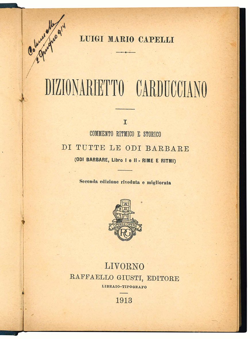 Dizionarietto carducciano. I. Commento ritmico e storico di tutte le Odi barbare (Odi barbare, Libro I. e II. - Rime e ritmi) - II. Commento di Giambi ed epodi e Rime nuove. Seconda edizione riveduta e migliorata.