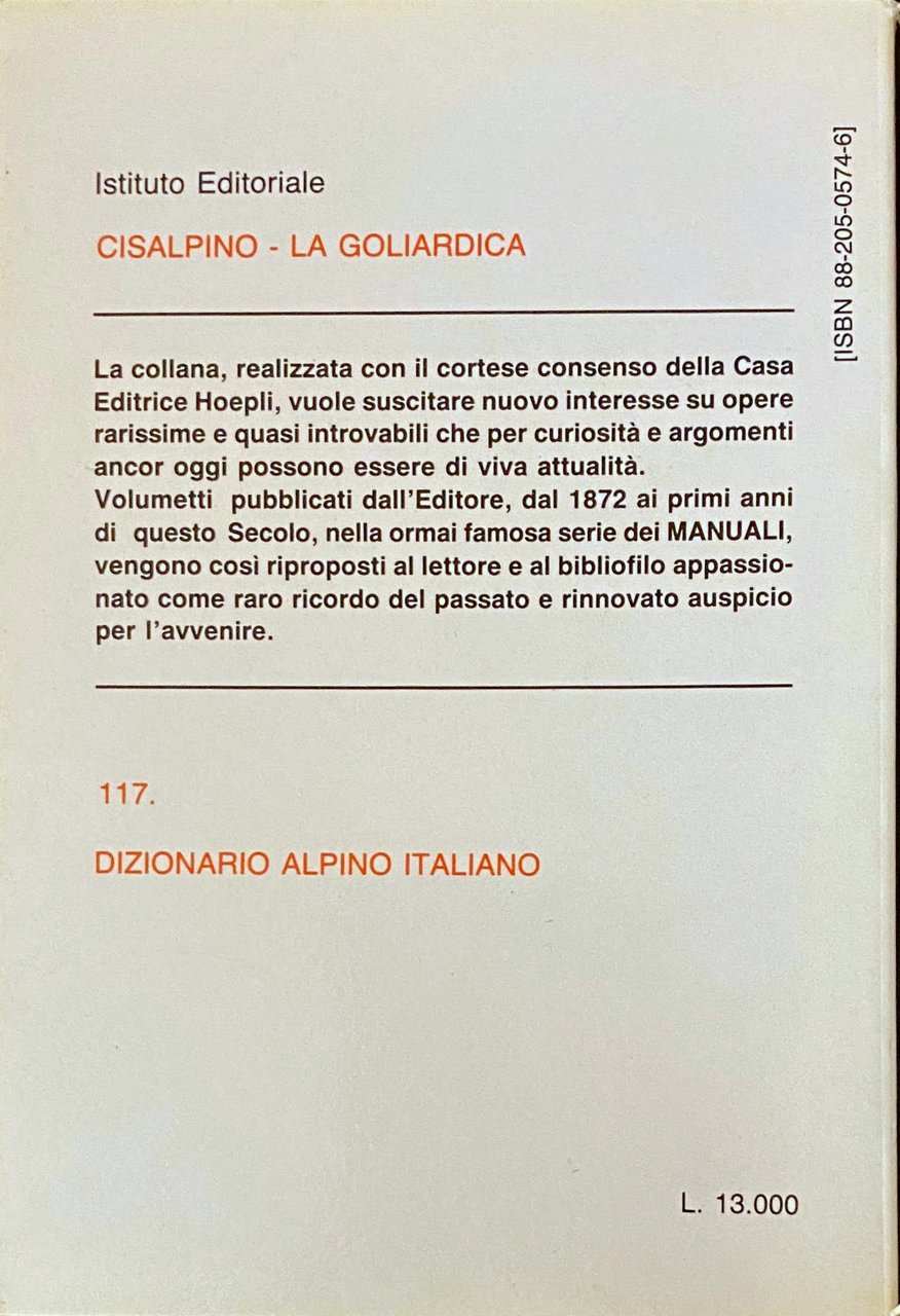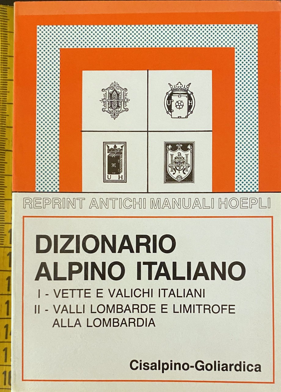 - Dizionario geografico, Dizionario alpinistico, Collezionismo, Ristampe anastatiche, Geografia fisica, Enciclopedie, Dizionari, Montagna, Termini, Attrezzi, Scalate, Alpi italiane, Alpinismo, Manualetti, Manuali, Divulgazione, Escursioni, Ascensioni, Club alpino, Manualetti Hoepli, Percorsi, Salite, Viaggio, Guide turistiche, Montagne, Vette, Cime, Classificazione, Difficoltà, Istruzioni, Libri da collezione, Storici, Ottocento, Novecento, Vocaboli tecnici, Valichi, Valli, Trentino Alto Adige, Dolomiti, Svizzera, Valtellina, Lombardia, Rifugi, Altimetria, Idrografia, Accessi, Viabilità, Strade, Orientamento, Indice alfabetico, CAI, Esplorazione, Ghiacciai, Guide locali, Dizionari tecnici