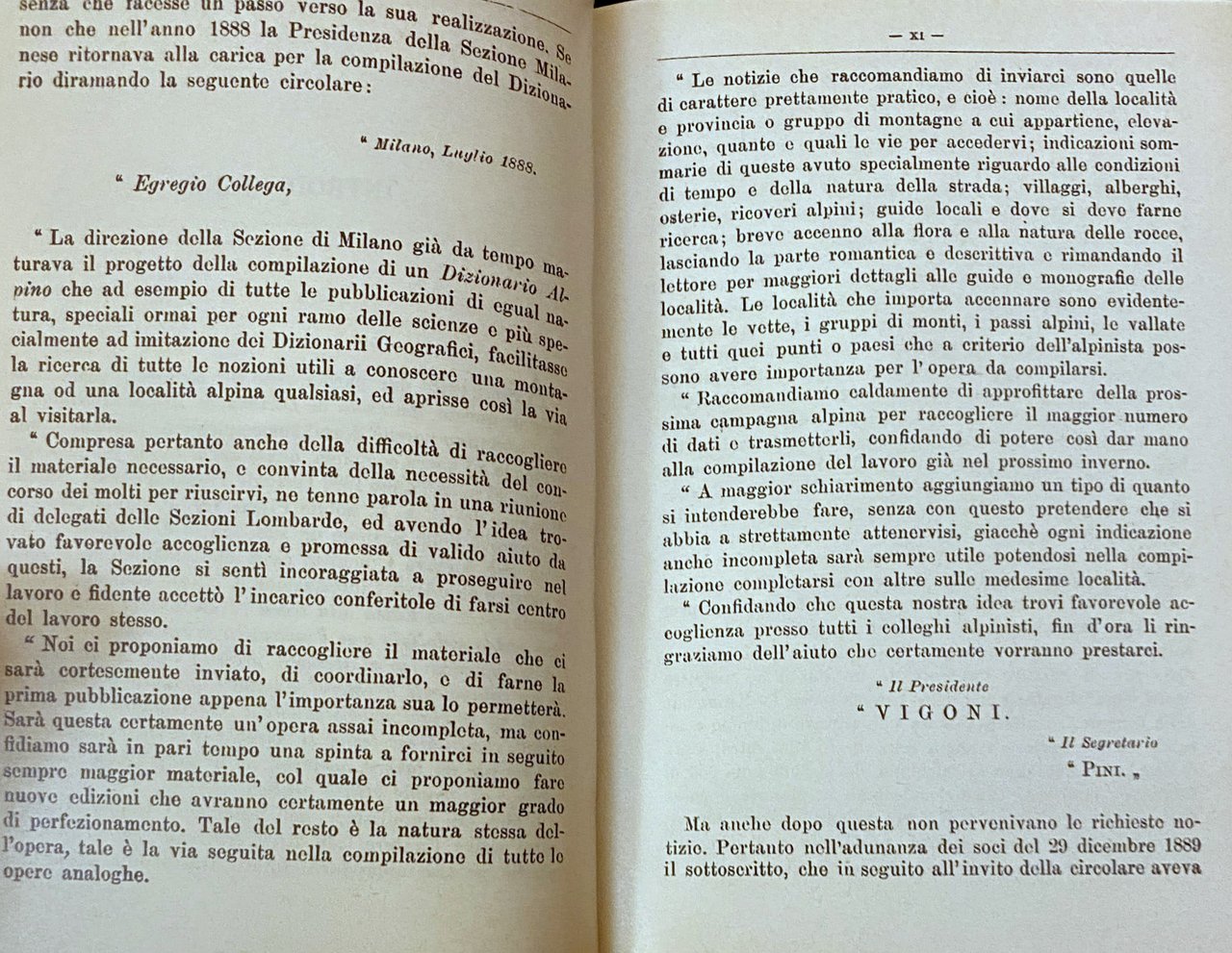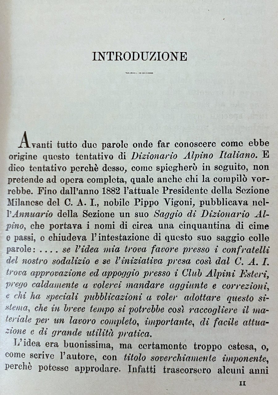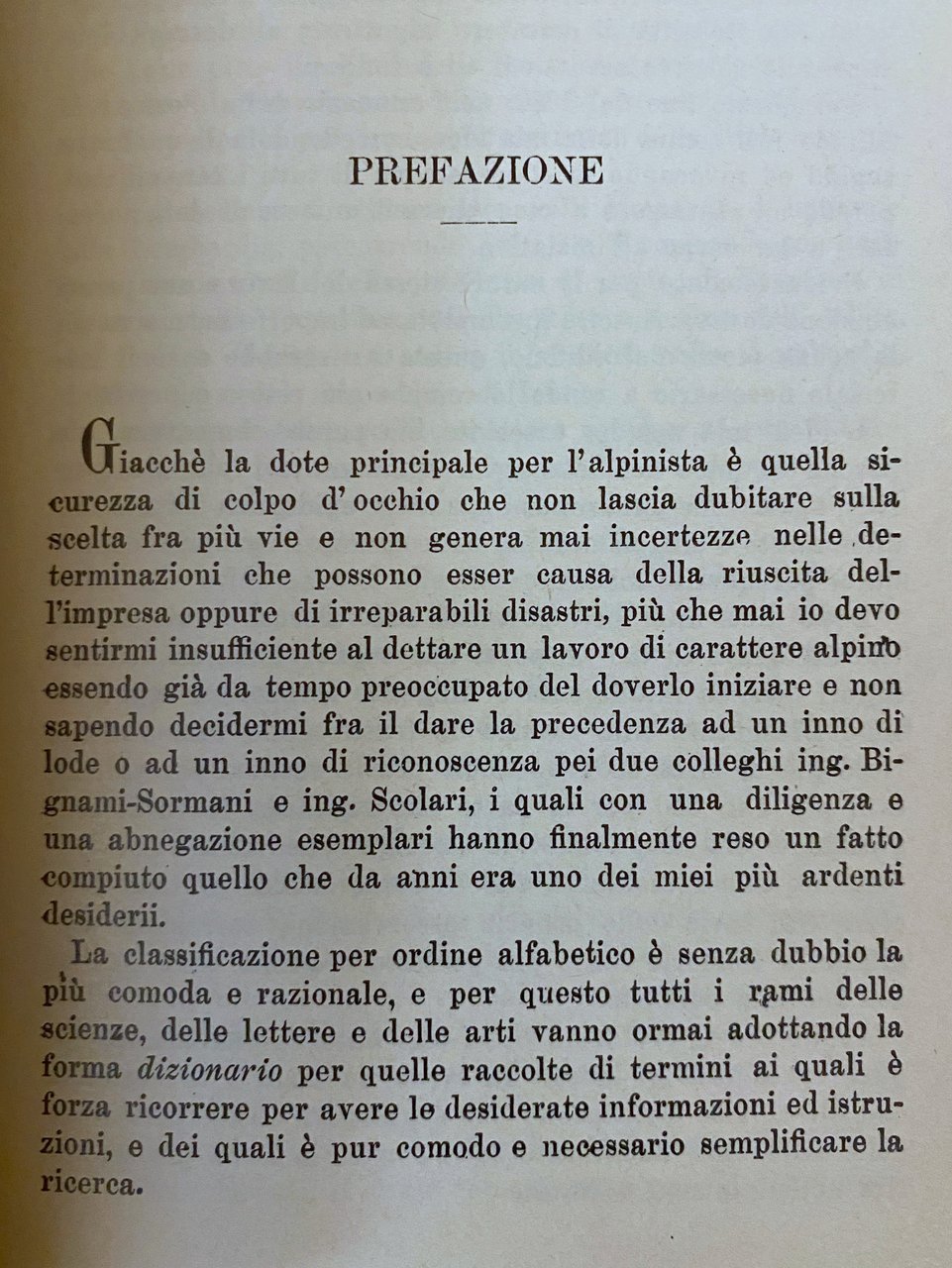 PREFAZIONE. Giacché la dote principale per l'alpinista è quella sicurezza di colpo d'occhio che non lascia dubitare sulla scelta fra più vie e non genera mai incertezze nelle determinazioni che possono esser causa della riuscita dell'impresa oppure di irreparabili disastri, più che mai io devo sentirmi insufficiente al dettare un lavoro di carattere alpino essendo già da tempo preoccupato del doverlo iniziare e non sapendo decidermi fra il dare la precedenza ad un inno di lode o ad un inno di riconoscenza pei due colleghi ing. Bignami-Sormani e ing. Scolari, i quali con una diligenza e una abnegazione esemplari hanno finalmente reso un fatto compiuto quello che da anni era uno dei miei più ardenti desiderii. La classificazione per ordine alfabetico è senza dubbio la più comoda e razionale, e per questo tutti i rami delle scienze, delle lettere e delle arti vanno ormai adottando la forma dizionario per quelle raccolte di termini ai quali è forza ricorrere per avere le desiderate informazioni ed istruzioni, e dei quali è pur comodo e necessario semplificare la ricerca.