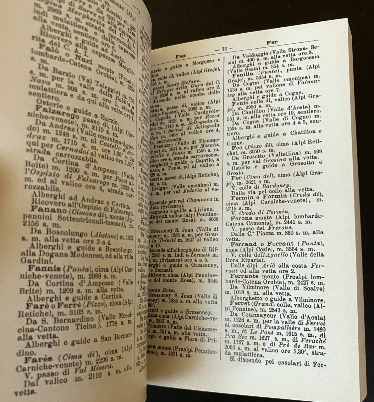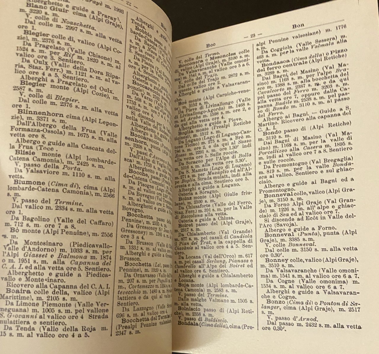 Soggetti: Dizionario geografico alpinistico, Collezionismo, Ristampe anastatiche, Geografia fisica, Enciclopedie, Dizionari, Montagna, Termini, Attrezzi, Scalate, Alpi italiane, Alpinismo, Manualetti, Manuali, Divulgazione, Escursioni, Ascensioni, Club alpino Percorsi, Salite Viaggi Guide eco-turistiche Montagne, vette, Cime, Classificazione, Difficoltà, Istruzioni, Libri da collezione, Storici, Ottocento, Novecento, Vocaboli tecnici, Valichi, Valli, Trentino Alto Adige, Dolomiti, Svizzera, Canton Ticino, Como, Bergamo, Brescia, Valtellina, Intra, Ossola, Lombardia, Rifugi, Altimetria, Idrografia, Accessi, Viabilità, Strade, Orientamento, Indice alfabetico, CAI, Esplorazione, Ghiacciaio, Cornone di Blumone Courmayeur cresta Punta Gnifetti Canalone Capanna Regina Margherita Lyskamm Metri Monte Bianco Monte Rosa Neve fresca Nevoso Nord Gran Paradiso Gran Sasso Ascensione Lago Rocce Parete Pareti Rocciosa Salita Zermatt Zinal Chamonix Monviso Cresta Pernottare Panorama Guide locali Cammino Ricovero Altezza Giulie Isonzo Sentieri Ghiaccio Carniche Bollettino Prealpi Leponzie Biella Valsesia Graje Adda Passi Cenisio Pennine Seigne Retiche Marittime Genova Cozie Colli Altare Panie Apuane Serchio Macra Appennini Liguria Piemonte Friuli Venezia Giulia Veneto Cartografia Mappe Dufour Ball Cederna Breuil Giomein Cervinia Luoghi Marmolada Soccorso ferrata Arrampicata Olinto Giovanni Marinelli Friedrich Ratzel Leonardo Ricci Sebastiano Crinò Frane Valanghe Monte Amiata Giotto Dainelli Dolfi Renato Biasutti Alberghi Osterie Elenchi Ristoranti Locarno Canobbio Mulattiera Valico Asiago Aosta Bagni Cime Ferdinando Uboldi Nepomuceno Bolognini Cortina d'Ampezzo Pinzolo Campiglio Alloggio Dormire Indicazioni Consigli Scienze geografiche Orografia Coglians Bormio Tolmezzo Rutor Gite Glacier San Bernardo Moncalieri Vintage fuori catalogo Mountaineering gazetteer, Collectibles, Anastatic reprints, Physical geography Encyclopedias Dictionaries Mountain Terms Tools Climbs Italian Alps Mountaineering Handbooks Manuals Dissemination Excursions Ascents Alpine Club Routes Climbs Travel Eco-tourist guides Mountains Peaks Classification Difficulty Instructions Collectible books out of print Historical 19th century 20th century Technical vocabulary Crossings Valleys Dolomites Switzerland Lombardy Refuges Altimetry Hydrography Access Traffic Roads Orientation Alphabetical Index Exploration Glacier Ridge Meters Mont Blanc Fresh Snowy North Ascension Lake Rocks Face Rocky Walls Climb Ridge Overnight stay Local guides Walk Shelter Julian height Ice paths Bulletin Prealps Passes Hills Apennines Piedmont Cartography Maps Places Rescue Climbing Landslides Avalanches Hotels Taverns Lists Restaurants Mule track Peaks Accommodation Sleeping Directions Advice Geographical sciences Orography Excursions