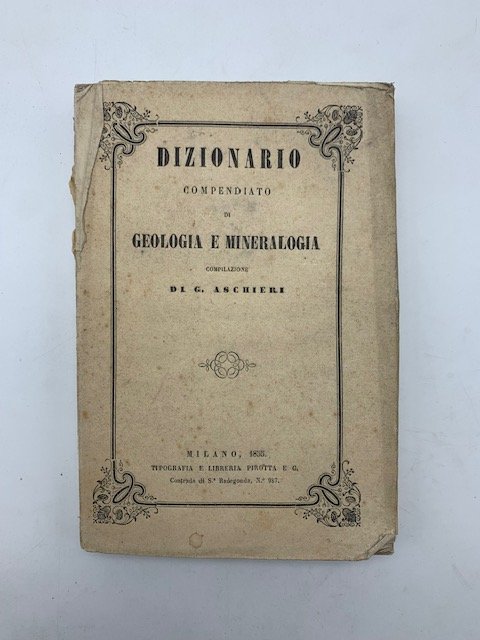 In 16 (cm 12,5 x 18,5), pp. LX + 270 + (2) con tabelle nel testo. Pagine intonse. Fioriture sparse alle pagine. Danno riparato al dorso. Brossura editoriale. Edizione originale di questo dizionario mineralogico.