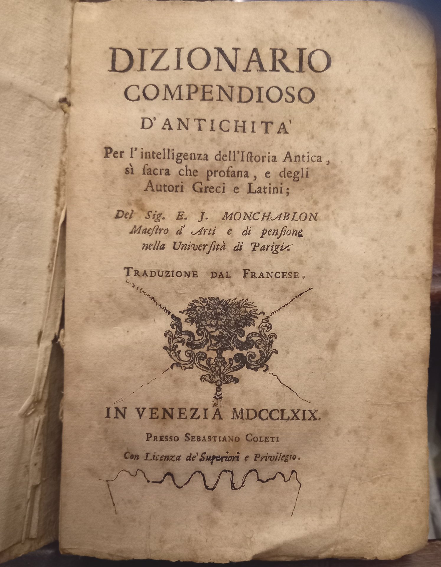 Dizionario compendioso d'antichità per l'intelligenza dell'istoria antica, sì sacra che profana, e degli autori greci e latini; del sig. E.J. Monchablon maestro d'arti e di pensione nella Università di Parigi. Traduzione dal francese