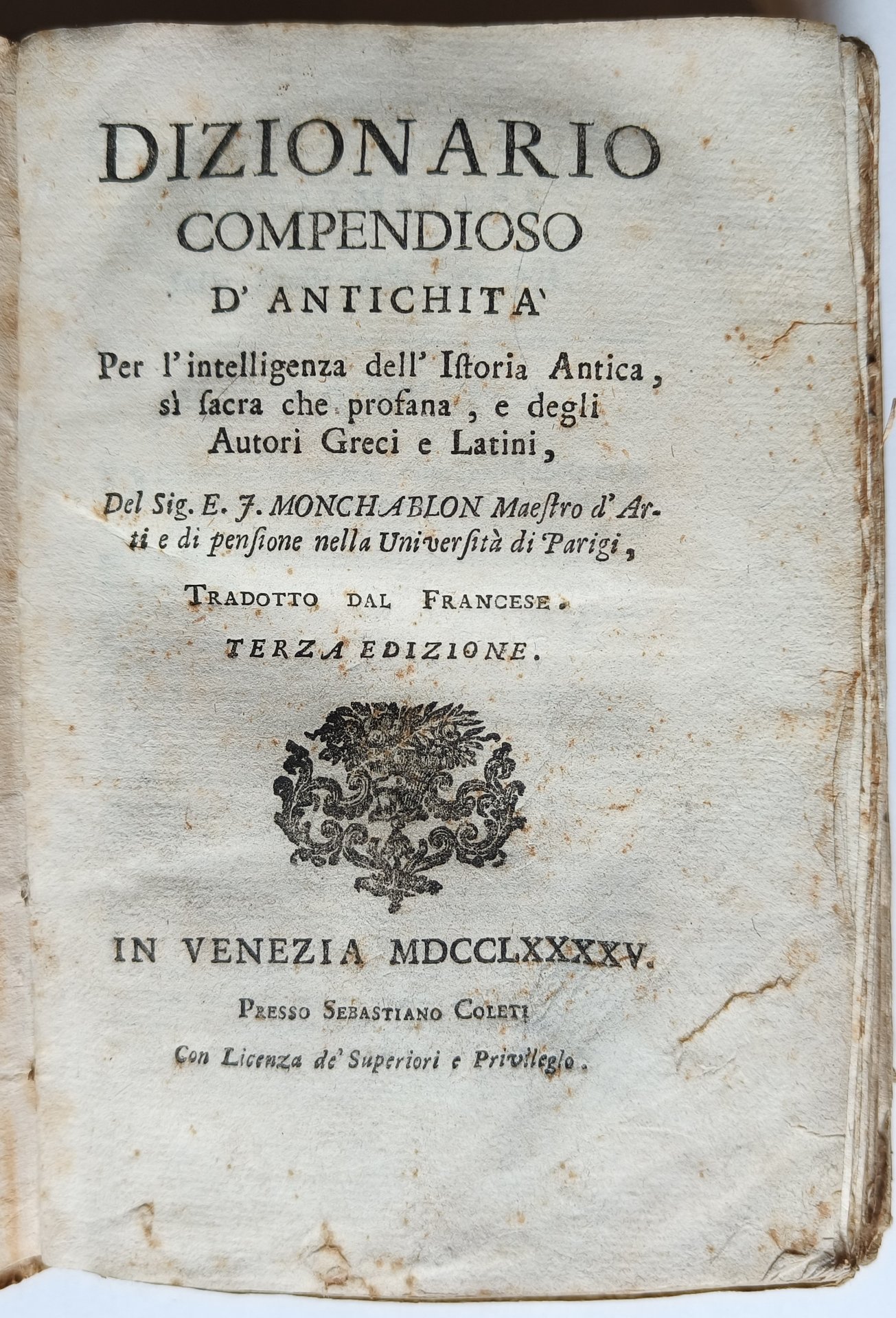 Dizionario compendioso di antichità. Per l'intelligenza dell'Istoria antica, sì sacra che profana, e degli Autori Greci e Latini. Del Sig. E. F. Monchablon Maestro d'arti e di pensione nella Università di Parigi, tradotto dal Francese. Terza edizione. In Venezia 1795. Presso Sebastiano Coleti.