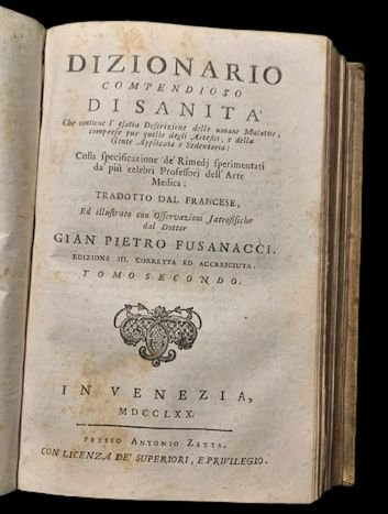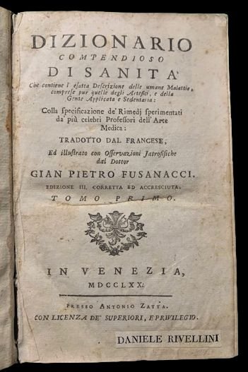 In 8° grande; tre tomi in un volume: 335, (1) pp.; VIII, 17-328 pp.; VIII, 232 pp. Legatura coeva in piena pergamena con titolo impresso a secco al dorso. Tagli rossi. Esemplare in ottime condizioni di conservazione. Terza edizione riveduta e notevolmente aumentata di quest'opera del noto enciclopedista padovano, Gian Francesco Pivati (anche Gianfrancesco Pivati) Padova 1668 Venezia 1754). Pivati, sulla scorta dei grandi enciclopedisti francesi, pubblicò diverse opere a carattere enciclopedico, alcune anche sotto pseudonimo come quella qui presentata. Come ben evidenziato dal Melzi, Fasanucci Giovanni Pietro è in realtà Gian Francesco Pivati (anche Gianfrancesco Pivati) come dall'anagramma esplicato dal Melzi nel suo Dizionario di opere anonime e pseudonime, Tomo I, Milano, Pirola, 1848, pag, 434. Fra le opere più conosciute di Pivati vi è il notissimo Nuovo dizionario scientifico e curioso del Sacro e del Profano. Nell'opera qui presentata viene raccolta in forma estesa tutta la conoscenza medica della seconda metà del settecento con numerosissime voci a tema farmaceutico con piante e radici e ricette per la preparazione di medicinali. Edizione in buone-ottime condizioni di conservazione.