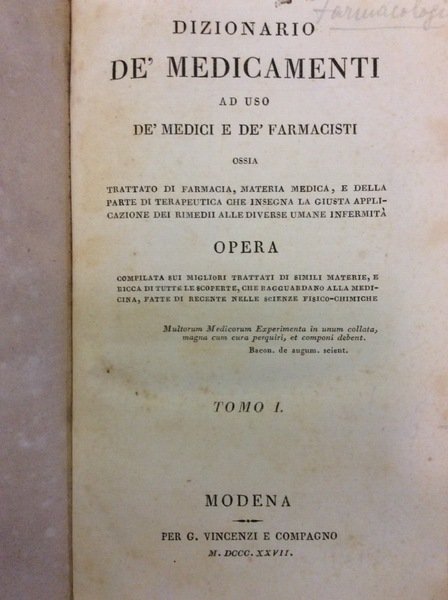 In-8 p. (mm. 215x140), 5 volumi, mz. pelle coeva, fregi e titolo oro al dorso, pp. XV,552; 590; 549; 615; XXXIV,35-262. E' questo un trattato di farmacia, materia medica, e della parte di terapeutica che insegna la giusta applicazione dei rimedii alle diverse umane infermità. Opera compilata sui migliori trattati di simili materie, e ricca di tutte le scoperte, che ragguardano alla medicina, fatte di recente nelle scienze fisico-chimiche. Il 5° volume contiene una Appendice al Dizionario de' Medicamenti.. e un Indice alfabetico degli articoli contenuti nei quattro tomi ed Appendice del Dizionario...Con qualche fiorit. ma certamente un buon esemplare.