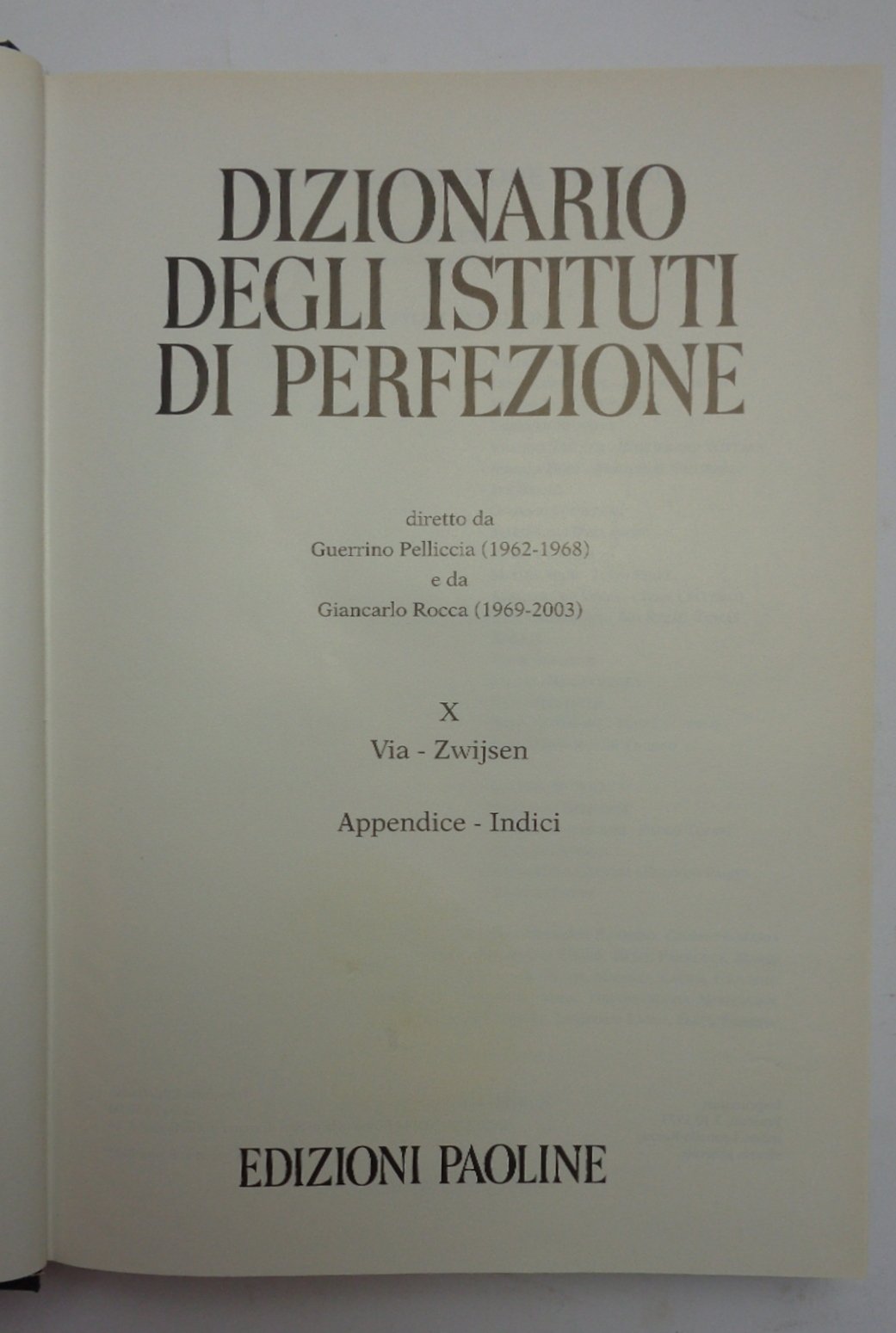 Dieci volumi (20x29 cm) con legatura editoriale in tutta tela ornata a quadrati dorati, con titolo al dorso. Numerazione e testo su due colonne. Vol. I (1974) A-Cam, XXXIV-1728 pagine. Vol. II (1975) Cam-Conv, XXVI-1726 pagine. Vol. III (1976) Conv-Fig, XXVI-1734 pagine. Vol IV (1977) Fig-Int, XXVI-1734 pagine. Vol. V (1978) Iona-Int, XXVI-1743 pagine. Vol. VI (1980) Monach-Pinz, XXVI-1751 pagine. Vol. VII (1983) Pio-Pza, XXVI-2079 pagine. Vol. VIII (1988) Saba-Spir, XXXII-2039 pagine. Vol. IX (1997) Spir-Véz, XXVI-1959 pagine. Vol. X (2003) Via-Zwi, XXVI-1683 pagine. Ultimo volume con Appendice e Indici, incluso "Indice analitico" di tutte le voci, di grande utilità per la consultazione del tutto. Numerose illustrazioni, a colori e in nero, nel testo. Ottime condizioni (solo la cerniera del volume 6 è usurata). L'opera più completa per conoscere la storia degli Ordini religiosi. Oltre 1.400 collaboratori da tutto il mondo per oltre 10.000 lemmi.