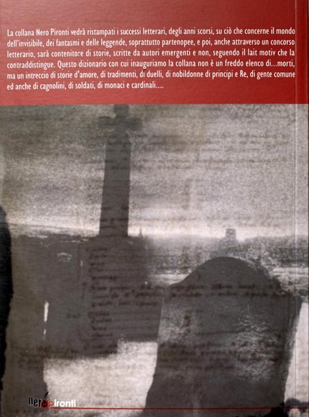 La collana Nero Pironti vedrà ristampati i successi letterari, degli anni scorsi, dei fantasmi e delle leggende, soprattutto partenopee, e poi, anche attraverso un concorso letterario, sarà contenitore di storie, scritte da autori emergenti e non, seguendo il lait motiv che la contraddistingue. Questo dizionario con cui inauguriamo la collana non è un freddo elenco di. morti, ma un intreccio di storie d'amore, di tradimenti, di duelli, di nobildonne di principi e Re, di gente comune ed anche di cagnolini, di soldati, di monaci e cardinali.