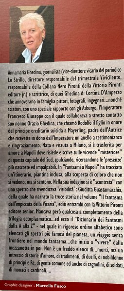 Annamaria Ghedina, giornalista (vice-direttore vicario del periodico Lo Strillo, direttore responsabile del trimestrale Vivicilento, responsabile della Collana Nero Pironti della Vittorio Pironti editore jr.) e scrittrice, di quei Ghedina di Cortina D'Ampezzo che annoverano in famiglia pittori, fotografi, ingegneri, nonché sciatori, con uno speciale rapporto con gli Asburgo, l'Imperatore Francesco Giuseppe con il quale collaborava a stretto contatto suo nonno Orazio Ghedina, che chiamò Rodolfo il figlio in onore del principe ereditario suicida a Mayerling, padre dell'Autrice che ricevette in dono dall'Imperatore un anello a testimonianza e ringraziamento. Nata e vissuta a Milano, si è trasferita per amore a Napoli dove risiede e scrive sulle vicende "misteriose" di questa capitale del Sud, spulciando, ricercandone le 'presenze più nascoste ed impalpabili'. In "Fantasmi a Napoli" ha tracciato un itinerario, piantina inclusa, alla scoperta di coloro che non si vedono, ma si sentono. Nella sua indagine si è "scontrata" con uno spettro che rivendicava visibilità": Giuditta Guastamacchia, della quale ha narrato la truce storia nel volume "Il fantasma dell'impiccata della Vicaria", editi entrambi con la Vittorio Pironti editore senior.