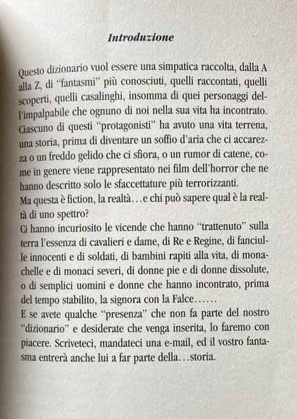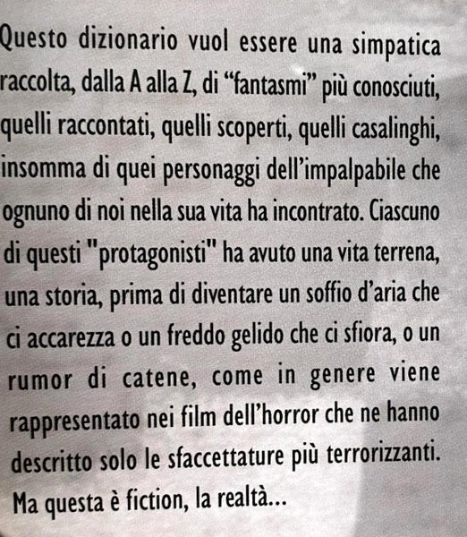 Mancava però qualcosa a completamento della trilogia ectoplasmatica. ed ecco il "Dizionario dei Fantasmi dalla A alla Z" - nel quale in rigoroso ordine alfabetico sono elencati gli spettri più famosi del pianeta, un viaggio senza frontiere nel mondo fantasma. che inizia a "vivere" dalla mezzanotte in poi. Non è un freddo elenco di morti, ma un intreccio di storie d'amore, di tradimenti, di duelli, di nobildonne di principi e Re, di gente comune ed anche di cagnolini, di soldati, di monaci e cardinali.
