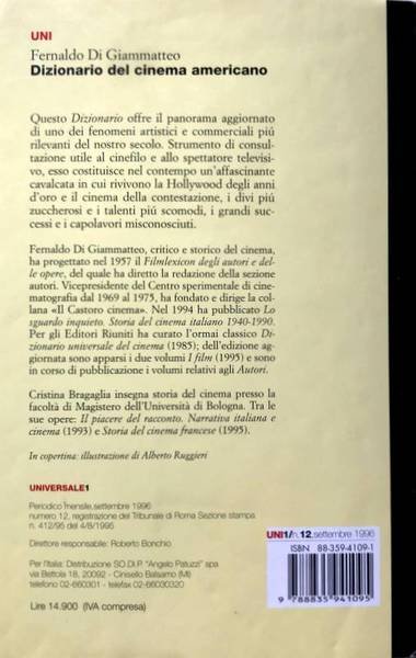 Soggetti: Cinema, Dizionari, Storia, Film, Registi, Spettacolo, Guide, Recensioni, Critica cinematografica, Titoli, Musica, Colonne sonore, Sceneggiatura, Soggetto, Musiche, Costumi, Scena, Produzioni, Hollywood, Attori, Attrici, Divi, Dive, Miti, Muto, Sonoro, Commedie, Americano, Italiano, Thriller, Gialli, Polizieschi, Noir, Novelle Vague, Commedia, Comici, Neorealismo, Classici, Opere generali varie, Libri Vintage, Fuori catalogo, Enciclopedie, Cinematografia americana, Star, Filmografia, Schede, Lumière, Capolavori, Cult, Regia, Trame, Cinefilia, Novecento, Comico, Melodramma, Anni Trenta e Quaranta, Dopoguerra, Anni Cinquanta, Anni Sessanta, Anni Settanta, Anni Ottanta, Anni Novanta, Quentin Tarantino, Hitchcock, Howard Hawks, Effetti speciali, Tecniche, Macchina da presa, Erich von Stroheim, Luis Bunuel, Fotografia, Dramma, Dreyer, Dziga Vertov, Ejzenstejn, Buster Keaton, Caligari, Capaev, Monsieur Verdoux, Montaggio, Vertov, Viridiana, Chien andalou, Jean Renoir, Accattone, Aleksandr Nevskij, Documentario, Nosferatu, Borghese, Corea del Sud, Federico Fellini, Fantascienza, Fantasy, Gangster, Sergio Leone, C'era una volta in America, Il Padrino, Scarface, Dialoghi, Stanley Kubrick, Steven Spielberg, René Clair, Ridley Scott, Narratologia, John Ford, Béla Balàzs, Bianco e nero, Panavision, Disney, Pixar, Cinemascope, Batman, Anthony Quinn, Marlon Brando, Marilyn Monroe, Al Pacino, Robert De Niro, Horror, Star Wars, Guerre Stellari, Oscar nomination, Paramount, Screwball comedy, Toy Story, University Press, Warner Bros, Western, Woody Allen, Blockbuster superhero, Midnight Cowboy, Nashville, Cat Ballou, Chicago, Back to the Future, Killer of Sheep, Daughters of the Dust, Nothing But a Man, Ali, Easy Rider, The Conversation, The Texas Chain Saw Massacre, Longtime Companion, The Matrix, The War Tapes, References, Robert Altman, Independent, Black Power, Nashville, Cinéma vérité, Civil Rights, Rumson, Martin Scorsese, Apocalypse Now, Citizen Kane, Censura, Donne, Picture, Filmmakers, Billy Wilder, Orson Welles, Jerry Lewis, The Graduate, Tom Cruise, Dustin Hofmann, Chinatown, Godfather, George Lucas, Rinascimento, Spike Lee, Oliver Stone, Tim Burton, David Lynch, Adrian Lyne, Steven Sodebergh, Joel and Ethan Coen, Julie Dash, Botteghino, Successi, Flop, The Exorcist, Jaws, Lo Squalo, Mary Poppins, West Side Story, Toro scatenato, Fair Lady, Bonnie and Clyde, Butch Cassidy, American Graffiti, Towering Inferno, Ben-Hur, Doctor Zhivago, River Kwai, Love Story, Sundance Kid, Rocky, Pulp Fiction, Gus Van Sant, The Great Train Robbery, To Die for, Wayne Wang, Smoke, Ed Wood, Vidor, Murnau, Cast, Crediti, Dati, Scenografia, Ruoli, Durata, Classifiche, Romanzi, Letteratura, Zelig, Zuppa d'anatra, Duck Soup, Io e Annie, Cinema, Dictionaries, History, Movies, Directors, Show, Guides, Reviews, Film criticism, Titles, Music, Soundtracks, Screenplay, Subject, Music, Costumes, Scene, Productions, Actors, Actresses, James Dean, Myths, Silent, Sound, Comedies, Italian, Detective, Comedy, Comedians, Neorealism, Classics, Miscellaneous general works, Books out of print, Encyclopedias, American cinema, Star, Filmography, Cards, Masterpieces, Direction, Plots, Cinephilia, Twentieth century, Comedian, Melodrama, 1930s, 1940s, Postwar Period, 1950s, 1960s, 1970s, 1980s, 1990s, Special Effects, Techniques, Camera, Photography, Drama, Editing, Documentary, Bourgeois, South Korea, Science Fiction, Once Upon a Time in America, Dialogues, Narratology, Black and White, Censorship, Women, Renaissance, Box Office, Successes, The Shark, Wild Bull, Credits, Data, Scenography, Roles, Duration, Rankings, Novels, Literature, Riferimento, Consultazione, Collezionismo, Reference, Consultation, Collectibles
