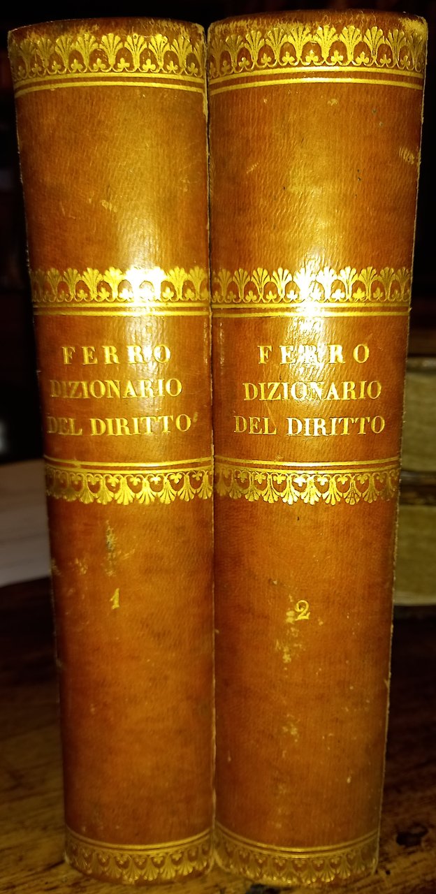 In-8 (21,5 cm) 2 voll XXIII (1) 783 (1);(6) 855 (1). Mezza pelle, piatti rivestiti di carta marmorizzata. FERRO, Marco (1750-1784): nacque a Padova il 9 apr. 1750 da Vincenzo. Studiò nel locale seminario e successivamente all'università, dove si laureò in legge; esercitò sin da giovane con grande successo la libera professione e ricoprì a lungo anche la carica di avvocato fiscale nell'armata veneta. La sua fama nella società veneta e nella cultura italiana è legata al Dizionario del diritto comune, e veneto, che contiene le leggi civili, canoniche e criminali, i principi del gius naturale, di politica, di commercio, con saggi di storia civile romana e veneta (Venezia 1778-1781), un vasto repertorio giuridico destinato ai giovani della "veneta advocatura" ma ben presto diventato prezioso per tutti gli studiosi delle istituzioni civili e politiche della Repubblica di Venezia. Quando ne iniziò la pubblicazione il F. era ancora molto giovane, ma già ricco di un'ampia e solida cultura ancorata alle più vive correnti filosofiche del secolo dei lumi; già il termine Dizionario rinvia chiaramente all'Encyclopédie di d'Alembert, ma nelle singole voci il debito e l'adesione profonda al pensiero illuminista francese sono evidenti anche al di là delle citazioni dirette. (Dizionario BiograficoTreccani). In-8 (21.5 cm) 2 vols XXIII (1) 783 (1); (6) 855 (1). Half leather, plates lined with marbled paper. FERRO, Marco (1750-1784): was born in Padua on April 9th. 1750 by Vincenzo. He studied in the local seminary and later at the university, where he graduated in law; from a young age he practiced the freelance profession with great success and also held the position of tax lawyer in the Venetian army for a long time. His fame in Venetian society and in Italian culture is linked to the Dictionary of Common Law, and Venetian, which contains civil, canonical and criminal laws, the principles of natural law, politics, commerce, with essays on Roman civil history and Venetian (Venice 1778-1781), a vast juridical repertoire intended for young people of the "Venetian advocature" but soon became precious for all scholars of the civil and political institutions of the Republic of Venice. When its publication began, F. was still very young, but already rich in a broad and solid culture anchored to the most lively philosophical currents of the Enlightenment; the term Dictionary already clearly refers to d'Alembert's Encyclopédie, but in the individual entries the debt and deep adherence to French Enlightenment thought are evident even beyond direct quotations. (Biographical Dictionary of Treccani)