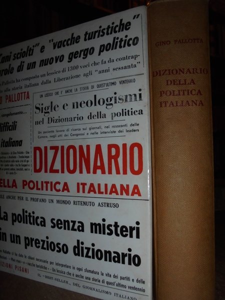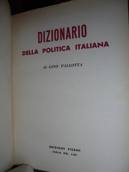 Gino, Pallotta. Isola dei Liri. Edizioni Pisani, 1965. DIZIONARIO della politica italiana. In-8°, tela edit. con sovracopertina. 623 pp. Segni del tempo nella sovracopertina. Il volume è ben conservato. Neg. mob. F Zanichelli. carc.