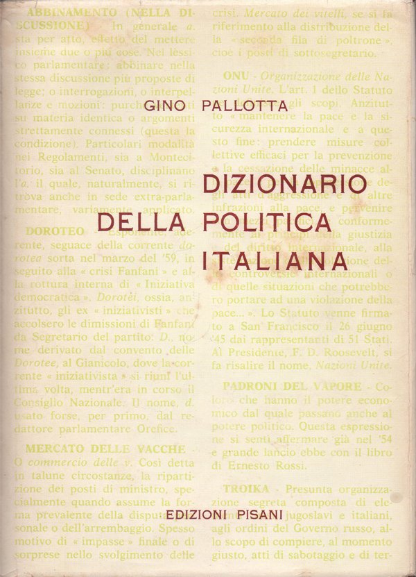 In-8° (21 x 15 cm), pp. 471, (1), legatura editoriale con sovraccoperta. Alla sovraccoperta, normali segni del tempo, in particolare pochi, piccoli, leggeri segni d'umido e pochi strappetti, senza perdite, ben rimarginati, al bordo superiore e a quello inferiore (vedi foto). Piccoli segni d'umido al taglio di testa. Firma d'appartenenza, a penna, al recto della guardia anteriore. Per il resto, ben conservato. Si tratta di un lessico politico composto da 1.300 voci.