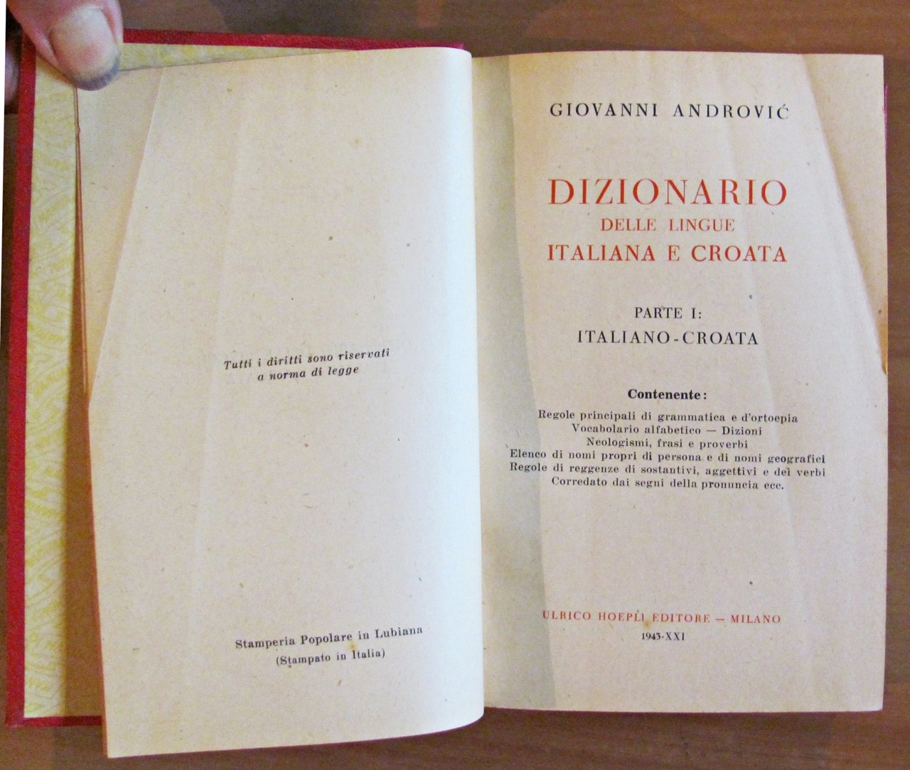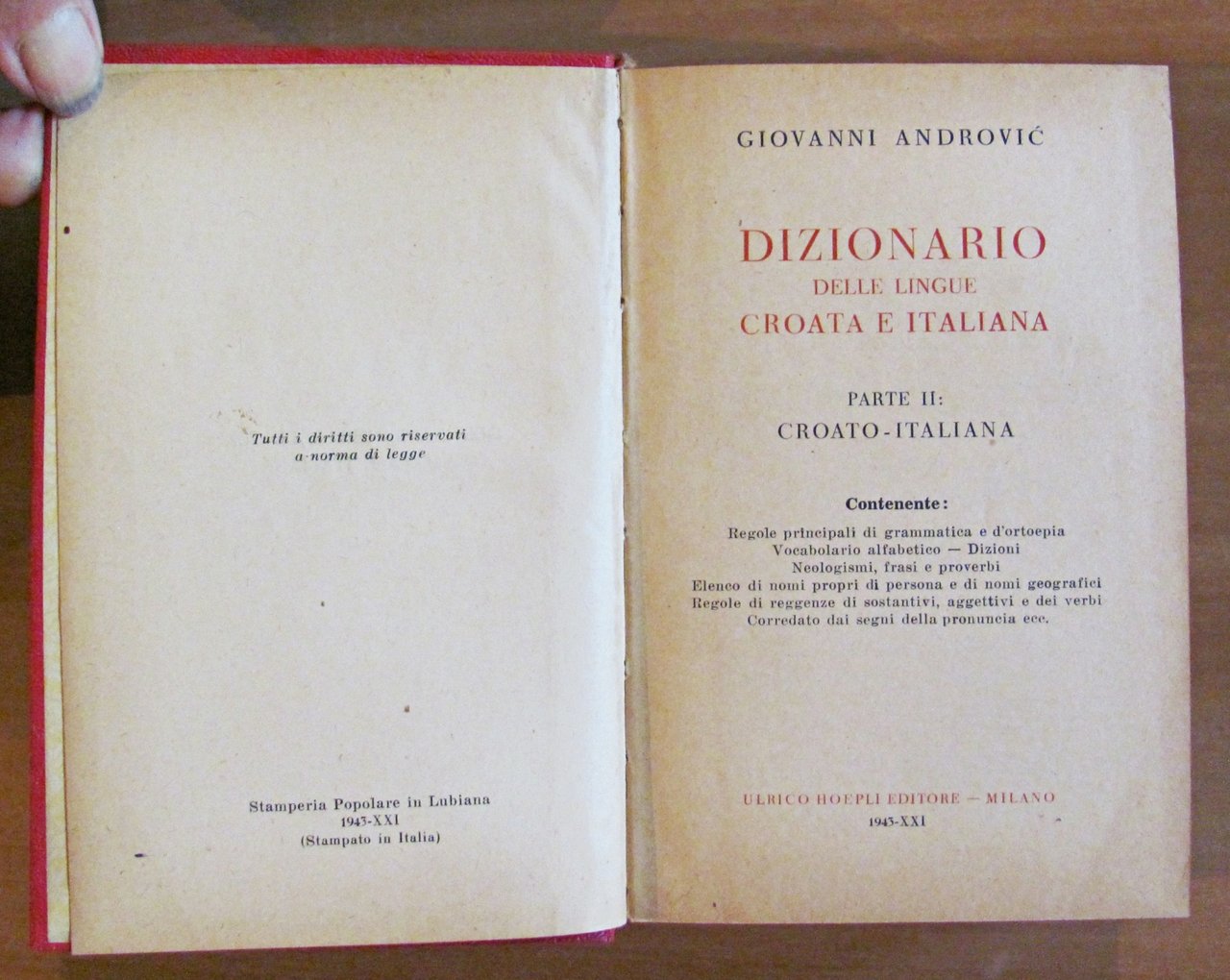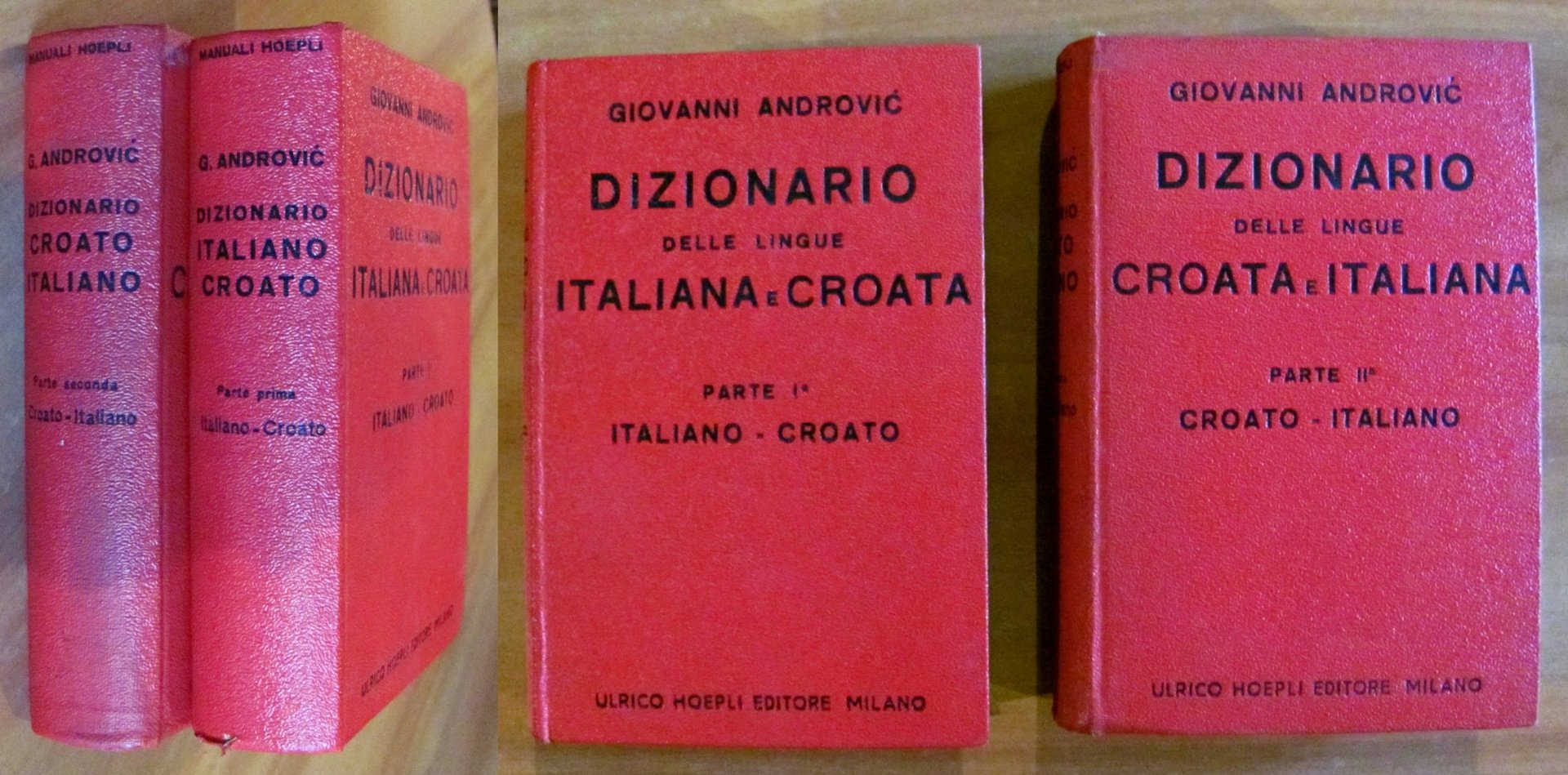 Parte I Italiano-Croato, Parte II Croato-Italiano. Manuali Hoepli. Ed. Ulrico Hoepli - Milano, 1943. Cartonati editoriali con titoli impressi ai piatti e ai dorsi. Lievissime macchioline alla retrocopertina della Parte I (come da foto). 10x16; pp.612 + 705. Ottimo stato. , Ottimo (Fine)