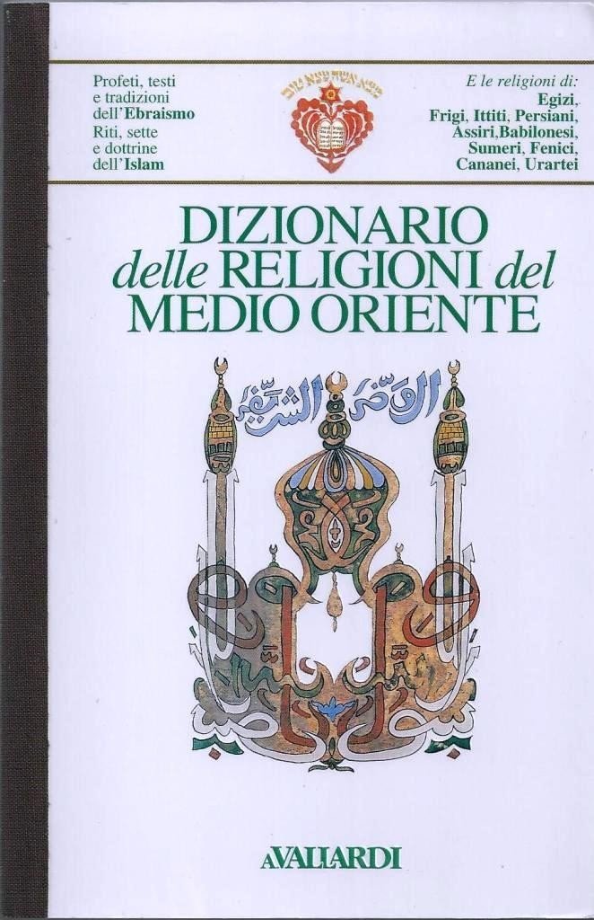 Dizionario delle religioni del Medio Oriente, a cura di Cristina Carminati e Vittorio Sirtori, A. Vallardi, s.l. (ma stampato a Cernusco sul Naviglio, Milano, presso le Industrie per le arti Grafiche Garzanti-Verga s.r.l.) 1994, prima ed., pp. 468, ill. b.n., 36 c. di tavv. f.t. ill. col., cm 19, br. ed. con dorso in tela. In testa alla prima di copertina. Profeti, testi e tradizioni dell’Ebraismo. Riti, sette e dottrine dell’Islam. E le religioni di: Egizi, Frigi, Ittiti, Persiani, assiri, Babilonesi, sumeri, Fenici, Cananei, Urartei. Perfetto.