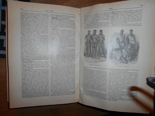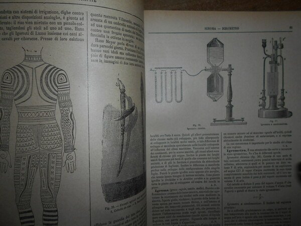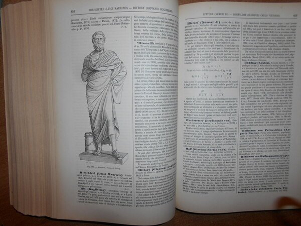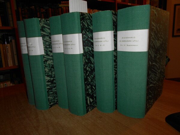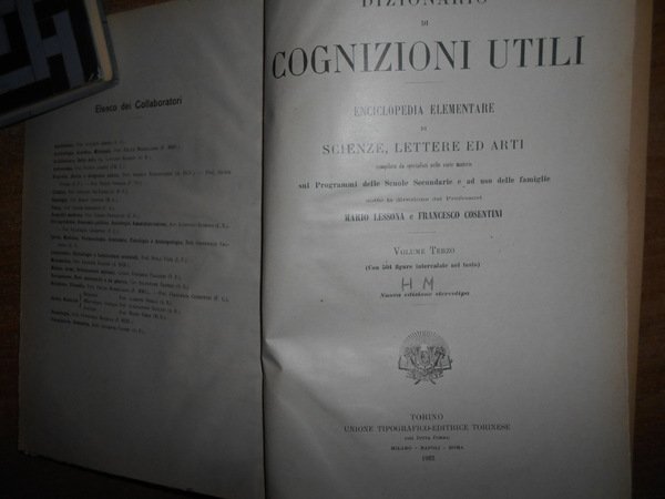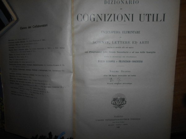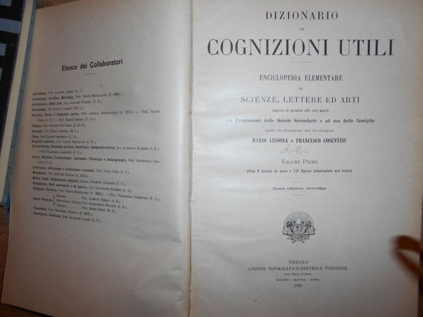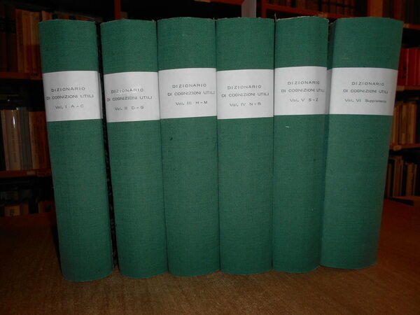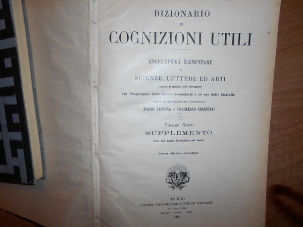 Mario, Lessona e Francesco, Cosentini. Torino, Unione Tipografico-Editrice Torinese, 1922. Dizionario di COGNIZIONI UTILI enciclopedia elementare di Scienze, Lettere ed Arti compilata da specialisti nelle varie materie. 6 volumi in-8° grande, m. tela verde con titoli al dorso entro etichetta bianca. Vol. I. A-C. viii, 1094 pp. con 2 tavole in nero e 711 figure intercalate nel testo.; Vol. II. D-G. 1146 pp. con 793 figure intercalate nel testo.; Vol. III. H-M. 1046 pp. con 504 figure intercalate nel testo.; Vo. IV. N-R. 1039 pp. con 449 figure intercalate nel testo.; Vol. V. S-Z. 1146 pp. con 519 figure intercalate nel testo.; Vol. VI. Supplemento. xii, 1411 pp. con 552 figure intercalate nel testo. In ottimo stato di conservazione con solida legatura artigianale e normali segni del tempo. Uff. stanz. antic. destra mob. 8