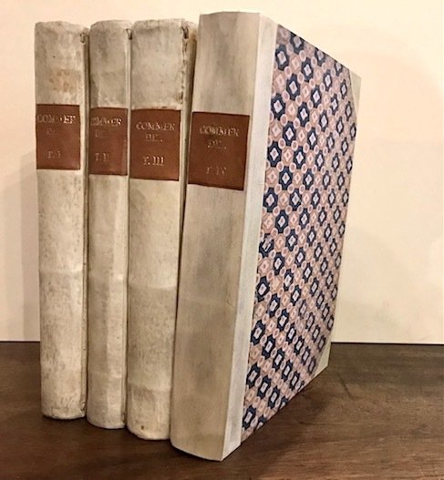 4to (cm. 25,5), 4 Voll., XV(I)-406 pp., 1 c.nn.; XX-382 pp., 1 c.nn.; 2 cc.nn., 478 pp., 1 c.nn.; 2 cc.nn., 399(1) pp. Marca editoriale calcografica ai frontespizi. Legature coeve in mz. pergamena con angoli. Piatti rivestiti in carta policroma. Titoli oro su tasselli in pelle al ds. Tagli colorati. Il quarto volume è stato recentemente rilegato in modo pressoché uniforme agli altri. Timbretto di collezione privata al frontis. del quarto vol. Lievi sporadiche fioriture, peraltro esemplare in ottimo stato di conservazione. Opera rara. Einaudi, 5100; Kress, n. 393.