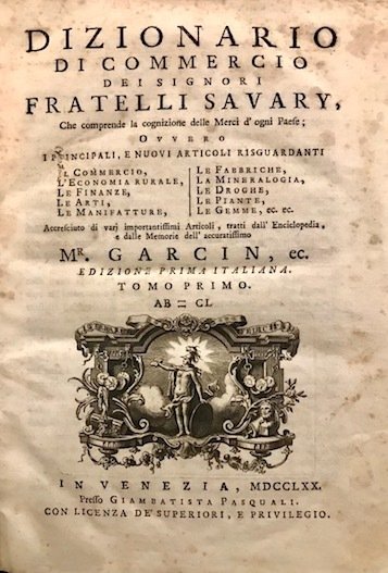 Dizionario di commercio dei signori fratelli Savary, che comprende la cognizione delle merci d’ogni paese; ovvero i principali, e i nuovi articoli risguardanti il commercio, l’economia rurale, le finanze, le arti, le manifatture, le fabbriche, la mineralogia, le droghe, le piante, le gemme, ec. ec. Edizione prima italiana. Tomo primo (. Tomo quarto)