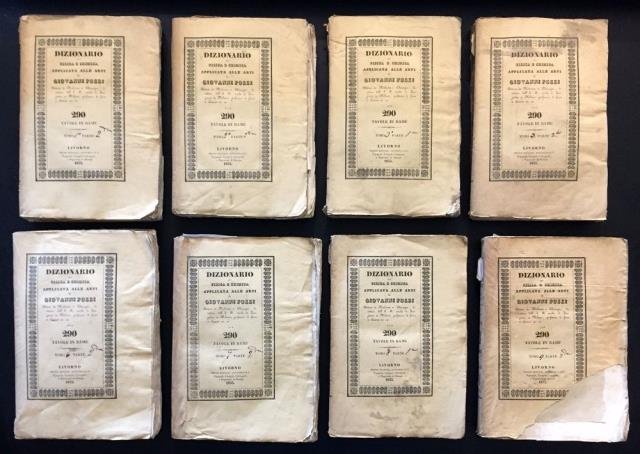 Bertani, Antonelli e C., Livorno, 1833. Otto volumi in 8vo: tomo I parte II, pp. 275 – 546; tomo II, parte II, pp. 257 – 511; tomo III, parte I, pp. 286; tomo III, parte II, pp. 287 – 568; tomo VI, parte II, pp. 309 – 610; tomo VII parte II, 289 – 609; tomo VIII, parte I, pp. 6 – 308; tomo IX, parte II, pp. 289 – 578. Tutti i volumi contengono belle tavole incise in rame in b/n rip. f. t, bross. edit. in carta giallina con titoli in nero. Opera non completa ma pur sempre, per i volumi presenti, di estremo interesse per la conoscenza, la sperimentazione e la ricerca. Si tratta dell'oro, delle pietre preziose, di vulcani e vulcanologia (nel volume IX è raffigurata l’eruzione del vulcano di Stromboli), ci sono tavole che illustrano apparecchi distillatori, fornaci per trattare i minerali in piombo, zinco, ottone, macchine per fabbricare la carta. Tranne usuali imperfezioni di brossura (con un ampio angolo di copertina mancante al volume IX) trattasi di esemplari stampati su carta forte, in parte intonsi, ben stampati e ben conservati.