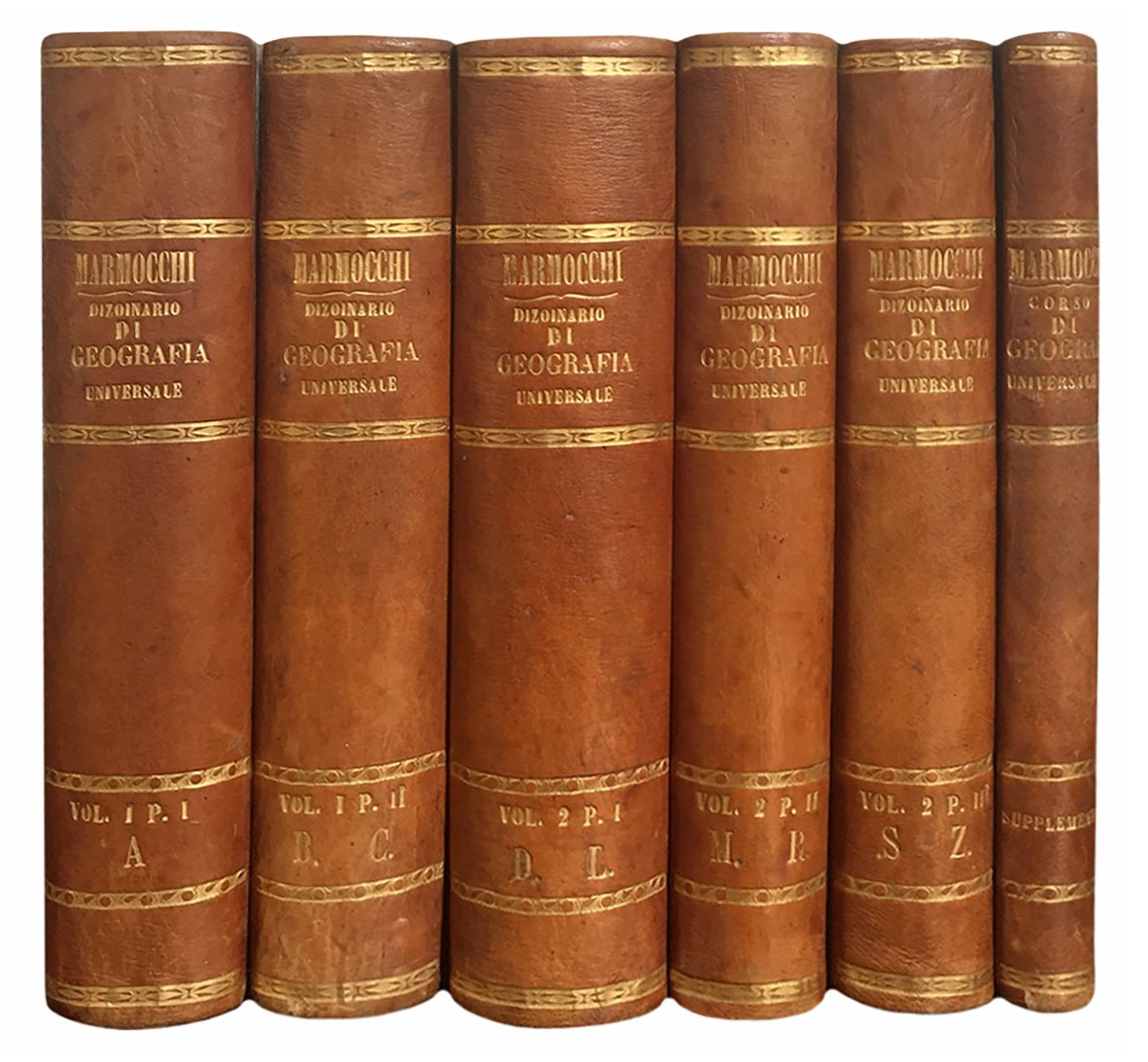 Dizionario di geografia universale contente gli articoli più necessari della Geografia fisica secondo le nuove idee ed i lavori più insigni de' geologi e de' naturalisti; della Geografia politica antica, del medio-evo e moderna; della Geografia storica e monumentale secondo le più recenti scoperte dei Viaggiatori e degli Antiquarii: della Geografia commerciale e della Statistica. (Insieme a:) SCIFONI, Felice. Specchio statistico rappresentante la bilancia politica del globo nel 1862 compilato e corredato di Note.