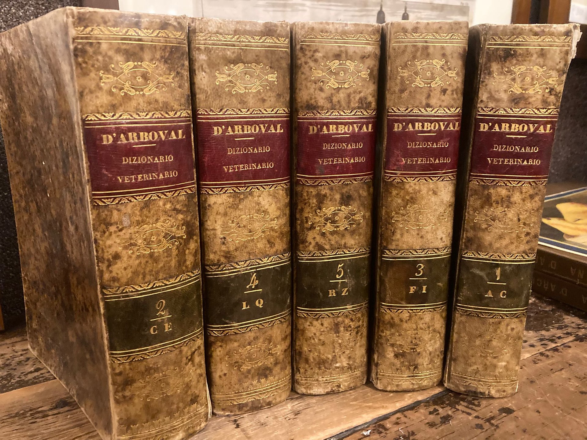5 voll. in-8° (232x160mm), pp. 781, (1); 723; 614, (2); 809, (1); 602; bellissima legatura coeva in p. pergamena tinta ed imitante la pelle con titolo e tomaison in oro su doppio tassello bicromo, filettin e fregi ornamentali in oro al dorso. Testo su due colonne. Ottimo esemplare. Prima edizione italiana di questo amplissimo dizionario medico-veterinario ordinato alfabeticamente. Al dizionario sono premessi, nel I vol., una lettera del traduttore al Consiglio Municipale di Forlì e un necrologio dell'Hurtrel d'Arboval estratto dalla 'Raccolta di medicina pratica veterinaria', agosto-settembre 1839. Il testo originale fu stampato a Parigi da Bailliere nel 1826. L'A. nacque a Montreuil-sur-Mer nel 1777 e morì nel 1839; fu veterinario fra i più stimati del suo tempo. Fumi, 3242.