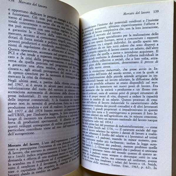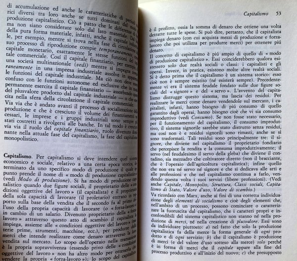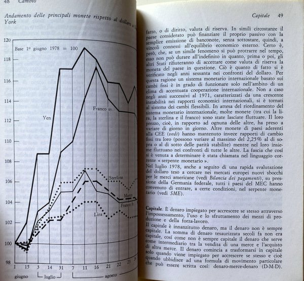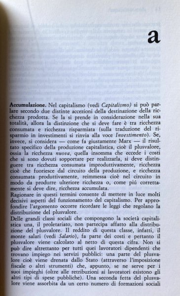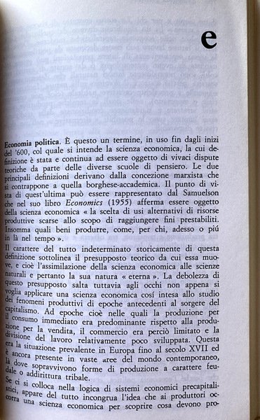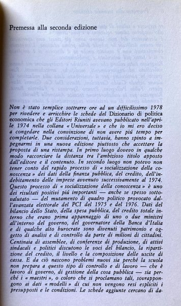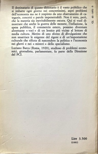 Soggetti: Politica economica, Dizionari tematici, Ideologie, Pensiero economico, Economisti, Teorie economiche, Storia economica, Capitalismo, Liberalismo, Liberismo, Classici, Valuta, Moneta, Denaro, Scambio, Merce, Lavoro, Sistema economico, Voci, Lemmi, Significato, Studi economici, Politica monetaria, Stato, Inflazione, Commercio estero, Produzione, Produttività, Mercato, Libertà, Investimenti, Finanza, Marxismo, Karl Marx, Friedrich Engels, Gustavo Mosca, Wilfredo Pareto, Adam Smith, John Maynard Keynes, Fordismo, Svalutazione, Capitale, Accumulazione, Investimento, Salario, Ricchezza, Distribuzione, Monopolio, Oligopolio, Concorrenza, Scienze delle finanze, Crisi strutturale, Congiuntura, Sviluppo economico, Stato, Surplus, Profitto, Debito, Consumo, Risparmio, Spesa, PIL, Libri Vintage Fuori catalogo, Riferimento, Consultazione, Bibliografia, Divulgazione scientifica, GATT, Schede, Fabrizio Barca, Franco Speranza, Guido Carandini, Alberto Zevi, Gianni Simula, Pio La Torre, Giorgio Rodano, Luciano Soriente, Baratta, Emilio Sereni, Federico Caffè, SME, COMECON, Energia, IRI, IRPEF, Tasse, Costi, Ambiente, Ecologia, Fluttuazione, Fondi, Esportazioni, Equo canone, OPEC, Partite correnti, Industria, Recessione, Questione meridionale, Credito, Contributi, Bilancio, Disavanzo, Entrate, CEE, Cambio, Bretto Woods, EFTA, Beni, Borsa, Classi sociali, Titoli, Debito pubblico, Buoni del Tesoro, Partecipazioni statali, Anni Settanta, Dopoguerra, Comunismo, Pianificazione economica, Parametri, Europa, EFTA, URS, Asia, Stati Uniti, Paesi arabi, Petrolio, Materie prime, Autosufficienza, Riforma agraria, Riforme, Kennedy Round, Terzo Mondo, Rendite, Valore, Fisco, Banca Centrale, Statistica, Modello classico, Occupazione, Redistribuzione, Teoria macroeconomica, Interesse, Curva di Phillips, Cicli, James M. Buchanan, Mercantilismo, Tobin, Economic policy, Thematic dictionaries, Ideologies, Economic thinking, Economists, Economic theories, Economic history, Capitalism, Liberalism, Liberalism, Classics, Currency, Money, Exchange, Commodities, Labor, Economic system, Voices, Lemmas, Meaning, Economic studies, Monetary policy, State, Inflation, Foreign trade, Production, Productivity, Market, Freedom, Investment, Finance, Marxism, Devaluation, Capital, Accumulation, Investment, Wage, Wealth, Distribution, Monopoly, Oligopoly, Competition, Financial sciences, Crisis Structural, Economic development, State, Profit, Debt, Consumption, Savings, Spending, Out of print books, Reference, Consultation, Bibliography, Scientific dissemination, Cards, Energy, Taxes, Costs, Environment, Ecology, Fluctuation, Funds, Exports, Fair rent, Current items, Industry, Recession, Southern question, Credit, Contributions, Budget, Deficit, Revenue, Exchange rate, Assets, Stock market, Member classes li, Securities, Public debt, Treasury bills, State holdings, Seventies, Postwar period, Communism, Economic planning, Parameters, Europe, United States, Arab countries, Oil, Commodities, Self-sufficiency, Agrarian reform, Reforms, Third world, Annuities , Value, Taxation, Central Bank, Statistics, Classic model, Employment, Redistribution, Macroeconomic theory, Interest, Curve, Cycles, Mercantilism