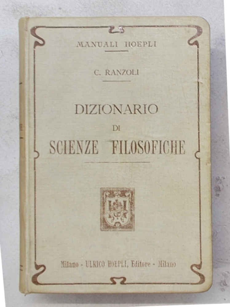 In 16° (cm. 15,5 x 10,5); pagg. VIII, 683; tela origin. con fregi e titoli impressi. Timbro al verso del frontespizio. Minimo difetto all'interno delle cerniere, ma ottimo. VG-. **Prima edizione. Manuale Hoepli. "Termini di filosofia generale, logica psicologia, pedagogia, etica, ecc."