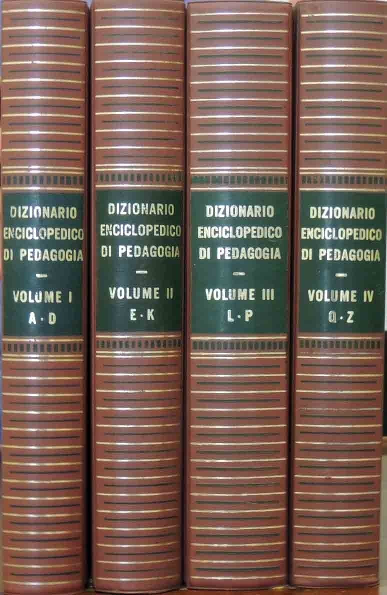 Dizionario enciclopedico di pedagogia, Editrice S.a.i.e., Torino 1961, 4 voll., pp. VIII, 3435, ill. b.n., cm 26, cart. ed. rivestito in plastica con titoli e fregi al dorso e decorazioni al piatto. Vol. I: A-D, pp. VIII, 775. Vol. II: E-K, pp. 861. Vol. III: L-P, pp. 952. Vol. IV: Q-Z e Indici, pp. 847. Titolo originale: Lexikon der padagogik del Deutsches Institut fur wissenschaftliche Padagogik (Munster, Germania) e dell’Institut fur Vergleichende Erziehungswissenschaft (Salzburg, Austria). Revisione a cura dell’Istituto Superiore di Pedagogia (Pontificio Ateneo Salesiano, Torino). Leggere tracce d’uso, minime fioriture, lievissima ingiallitura della carta, per il resto volumi ben conservati.