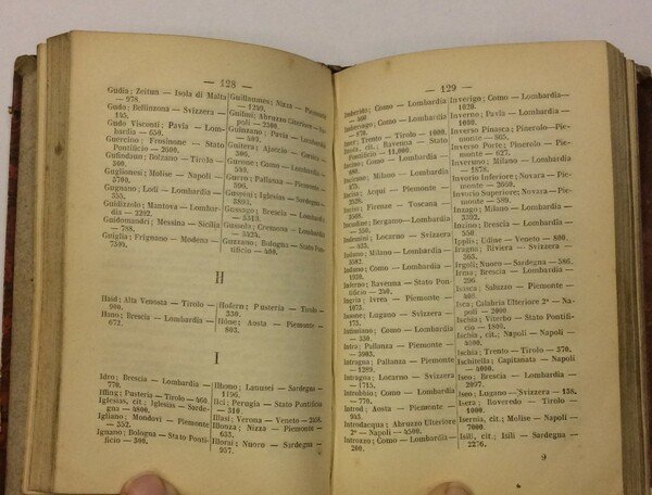 In-24 gr. (mm. 130x85), mz. pelle coeva, dorso a cordoni con fregi e titolo oro, pp. 290. Prima edizione di questo studio di demografia. Popolazione di tutti i comuni d'Italia al 1856, inclusi il Tirolo e la Svizzera italiana del Canton Ticino, l'Isola di Malta e la Corsica. Una seconda edizione venne stampata nel 1863. Alc. lievi fioriture intercalate nel testo; cerniera interna leggermente allentata, ma complessivamente buon esemplare.