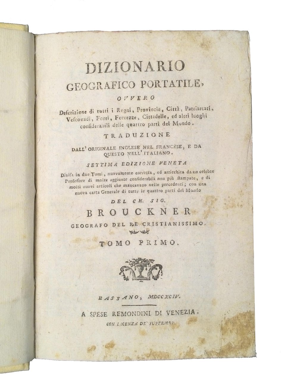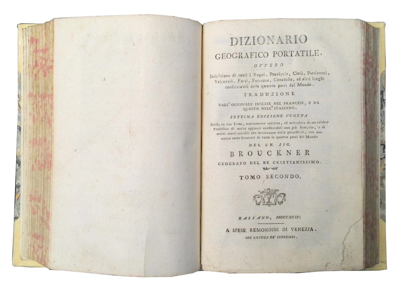 Dizionario geografico portatile, ovvero Descrizione di tutti i regni, provincie, citta?, patriarcati, vescovadi, forti, fortezze, cittadelle, ed altri luoghi considerabili delle quattro parti del mondo. Traduzione dall'originale inglese nel francese, e da questo nell'italiano. Settima edizione veneta divisa in due tomi, nuovamente corretta, ed arricchita da un celebre Professore di molte aggiunte considerabili […] con una nuova carta generale di tutte le quattro parti del mondo del ch. sig. Brouckner geografo del re cristianissimo. Tomo primo [- secondo].