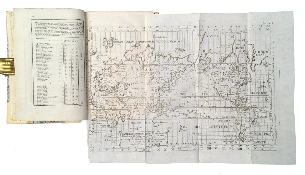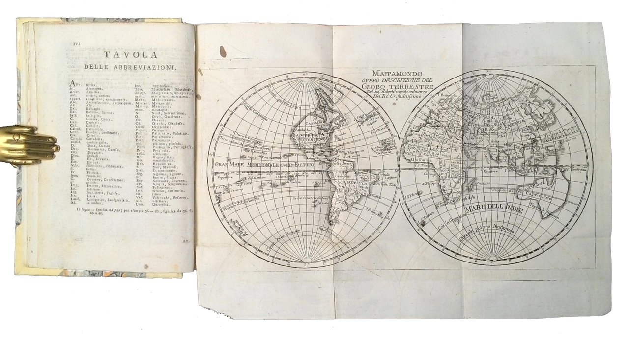 in-16° (184x126 mm); leg. moderna in mezza pergamena con angoli e carta marmorizzata ai piatti, finti nervi al dorso, titolo a cartteri dorati su tassello al dorso, tagli spruzzati di rosso; 1 vol. composto da due tomi; pp. XXVIII, 285, (3 c. bianche); 331, (1); marca tipografica al frontespizio, due belle carte geografiche inc. in rame f.t. più volte piegate raffiguranti il mappamondo (Mappamondo overo descrizione del globo terrestre del sig. Robert geografo ordinario del Re Cristianissimo) e il planisfero con indicate latitudini e longitudini (Carte generale du globe terrestre construite et publliée par le St. Isaac Brouckner geographe de S.M.T.C. examinée et approuvée pour M. Daniel Bernouilli (1700-1782), se vend a Venise chez Remondini - impr. Et libr. 1761). Testo stampato su due colonne. Poco diffusa e interessante edizione remondiniana dell'opera di Laurence Echard (1670 circa - 1730), tradotta prima dall'originale inglese in francese, e da questo in italiano. Il nome dell'Autore si deduce dall'avvertimento del traduttore dal francese all'italiano [Isacco Brockne (Brucner Isaak 1686-1762)] a c. a4r del Tomo 1, mentre il traduttore dall'inglese al francese [Vosgien, canonico di Vaucouleurs] si deduce dall'avvertimento dello stampatore a chi legge a c. a2v del Tomo 1. L'indicazione di edizione (settima veneta), precede la partizione dei volumi. L'opera è composta da: avvertimenti dello stampatore e dei traduttori, tavola delle abbreviazioni, carte, avvertimento sull'uso della carta del globo terrestre, tavola alfabetica del contenuto della carta, tavola delle nuove scoperte fatte nelle spiagge settentrionali del Mare del Sud, testo suddiviso in due tomi, indice latino-volgare dei nomi che si incontrano nel testo. Rif.: IT\ICCU\MILE\009005. OCLC, 5652680. Cond.: Presenza di qualche piccola macchia (probabilmente di inchiostro) non penalizzante il testo; leggere bruniture; mancanza di una piccola porzione dell'angolo inferiore esterno del frontespizio del tomo 2, non penalizzante il testo. Opera nel complesso in condizioni generali molto buone. -- Uncommon Remondini's edition of a portable geographical dictionary. Very good copy.