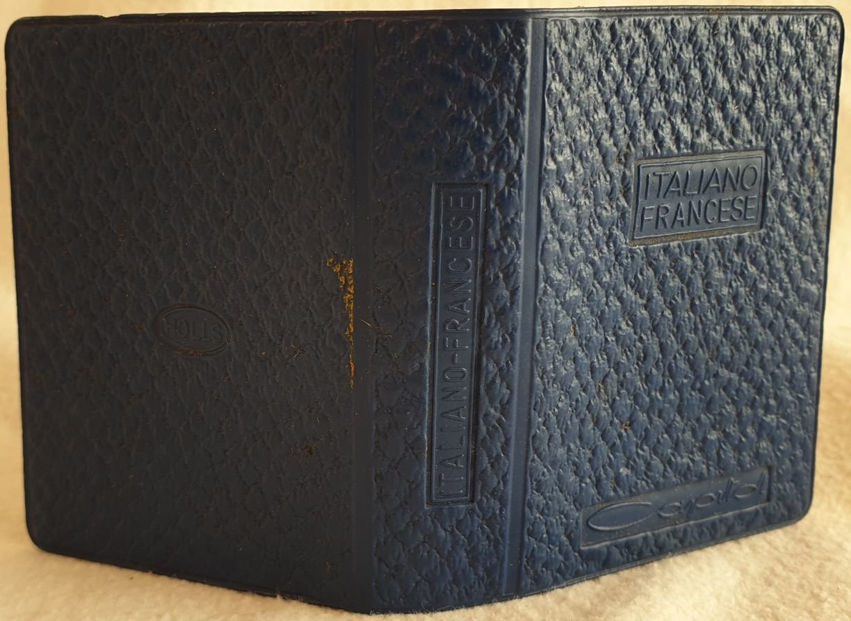 Miniatura del 1956 di questo dizionario italiano francese a cura di L. Salvi. All'inizio nozioni di grammatica, pesi e misure, frasi. Segue dizionario. In discrete condizioni. Copertina in similpelle editoriale in ottime condizioni generali con lievi usure ai margini e dorso. Legatura in discrete condizioni. Corpo del libro in parte staccato. Pagina 9 staccata. Frontespizio e pagina 9 riparata con il nastro adesivo. All'interno le pagine si presentano in ottime condizioni con rare fioriture. Le pagine dalla 3 alla 8 mancanti. In miniatura. Dim. 7,5x5,5 cm. Pp. 728+(12). Minature of 1956 of this italian french dictionary by L. Salvi. At the ebginning notions of grammar, weight and measures, sentences. Then dictionary. In fair conditions. Cover in editorial leather in very good general conditions slightly worn in the edges and spine. Binding in fair conditions. Page 9 is detached. The body of the book partially detached from the cover. Title page and page 9 is reapired with adhesive tape. Inside pages are in very good conditions with occasional foxings. Pages from 3 to 8 are loss. In miniatura. Dim. 7,5x5,5 cm. Pp. 728+(12).