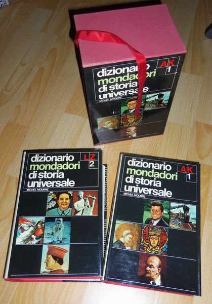[Storia universale](cm. 24.5) 2 volumi AK e LZ con astuccio rivestito in tela e stampato ai lati, nastrino estrai volumi in tessuto. Piena tela editoriale rossa, sovracoperta fig. a colori. -pp. 1217 + 1367. Contiene circa 35000 voci che abbracciano l'intera storia dell'umanit‡ dalle origini agli anni 70. Rispetto all'edizione originale francese del 1968, i curatori dell'edizione italiana hanno pensato di integrare il dizionario con voci relative all'Italia: mafia, sindacalismo, don Milani ecc. ma anche gli avvenimenti importanti ma non inclusi nella ed francese perchË occorsi successivamente come ad esempio le elezioniin Cile del 1973, la pace in Vietnam ecc. Condizioni Astuccio: usuali fioriture all'interno e un lato superiore parzialmente aperto. Condizioni Volumi: Ex libris Ravera alla prima pagina bianca di entrambi i volumi. Davvero lievissime e sporadiche fioriture alle sguardie e ai tagli. Peraltro assolutamente perfetti. [n44]