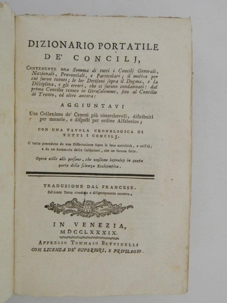 Dizionario portatile de' concilj, contenente una somma di tutti i concilj generali, nazionali, provinciali, e particolari ... aggiuntavi una collezione de' Canoni più rimarchevoli, distribuiti per materie, e disposti per ordine alfabetico; con una tavola cronologica di tutti i concilj ... traduzione dal francese. Edizione terza riveduta e diligentemente corretta