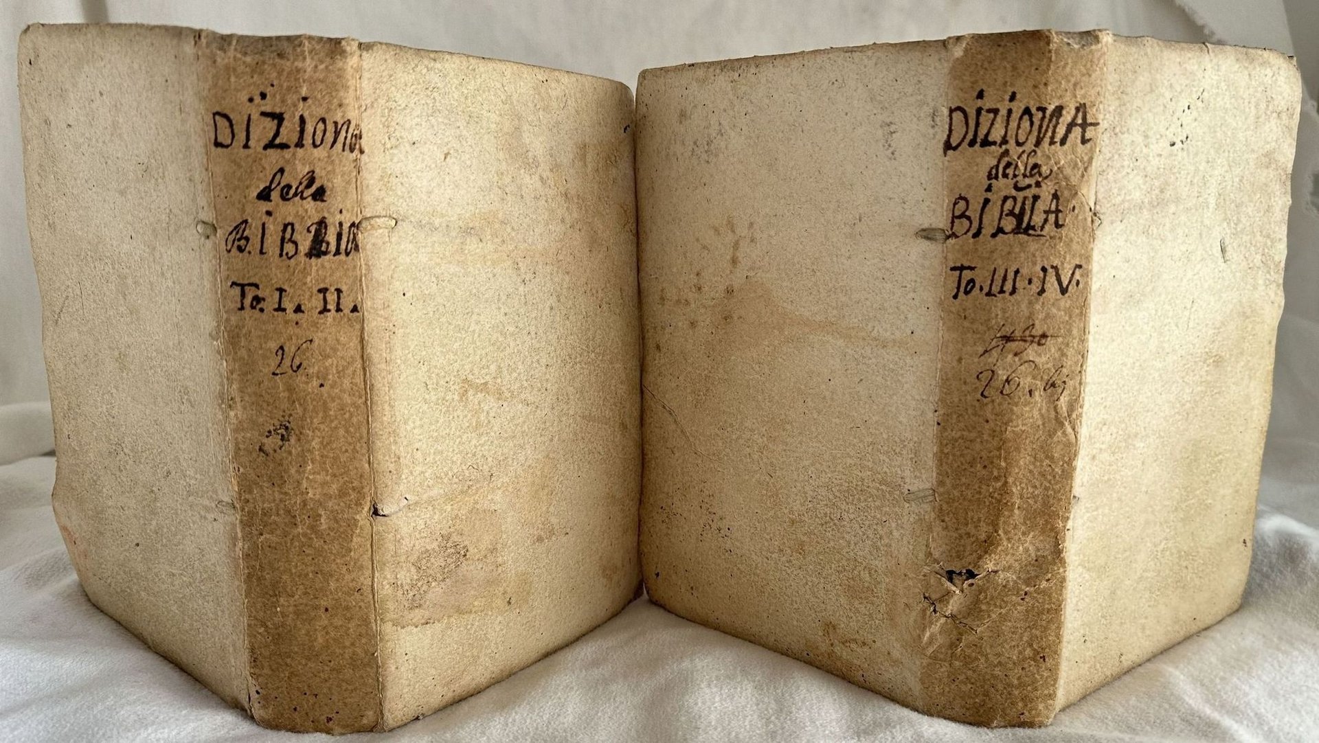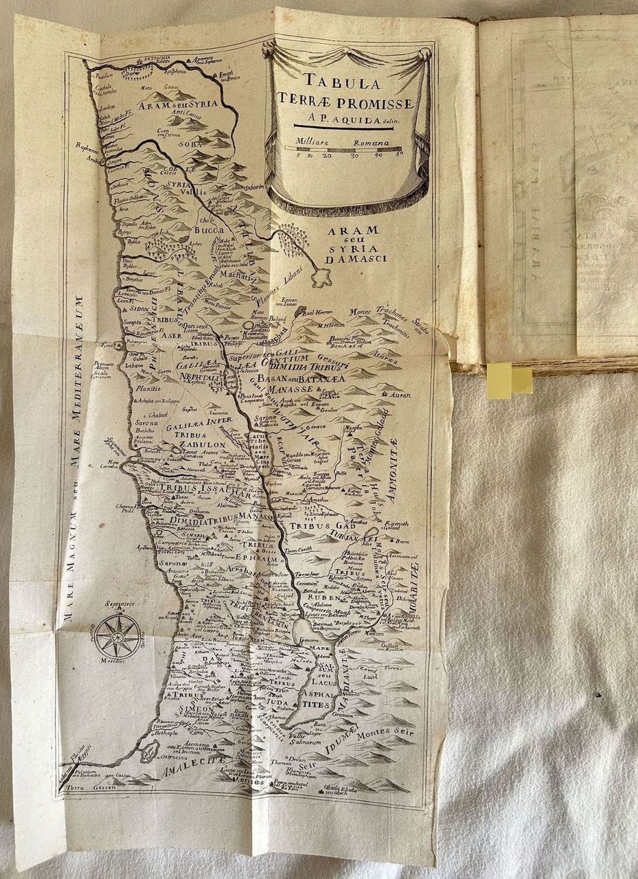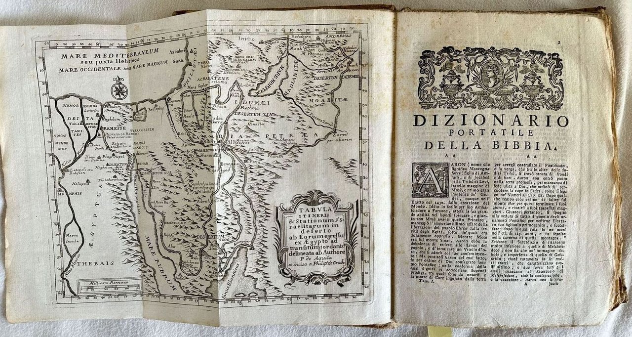 Bella edizione Remondini del 1768 di questa opera di esegesi biblica in forma di dizionario. Di autore anonimo ma attribuita a Pierre Barral (m. 1772) o a Pons Augustin Alletz (Cfr. NUC, v. 36, p. 410; British Museum General catalogue, v. 1 p. 457). All'interno sono presenti tre mappe ripiegate disegnate da Prospero dell'Aquila e incise da Filippo De Grado: Tabulae Terrae promisse; Carta topographica Iudeae; Tabula itineris & Stationum raelitarum in deferto ab Eorumgressu ex Aegypto ad transitum Jordanis. Numerosi i riferimenti alla religione ebraica. L'opera è formata da quattro tomi legati in due volumi ed è completa. In buone condizioni. Copertina cartonata coeva con titolo manoscritto al dorso in ottime condizioni con lievi usure ai margini e dorso. Legatura in discrete condizioni con rotture. Pagine in buone condizioni con fioriture. In 8. Dim. 20,5x14,5 cm. Pp. XXIV+244+XVI+246, XXIV+232+XXXVI+221+(7). Peso Kg. 0,520Beautiful Remondini editon of 1768 of thsi work about Bible esegesis written in form of ditionary. Of anonymous author but attributed to Pierre Barral (m. 1772) or to Pons Augustin Alletz (Cfr. NUC, v. 36, p. 410; British Museum General catalogue, v. 1 p. 457). Inside there are three folded maps drawn by Prospero dell'Aquila and engraved by Filippo De Grado: Tabulae Terrae promisse; Carta topographica Iudeae; Tabula itineris & Stationum raelitarum in deferto ab Eorumgressu ex Aegypto ad transitum Jordanis. Different refeerings to judaic religion. The work is amde up of four tomes bound in two volumes and it is complete. In good conditions. Carton cover with handwritten title in the spine in very good condition lightly worn in the extremities and spine. Binding in fair conditions with cracks. Pages are in good conditions with foxing. In 8. Dim. 20,5x14,5 cm. Pp. XXIV+244+XVI+246, XXIV+232+XXXVI+221+(7). Peso Kg. 0,520