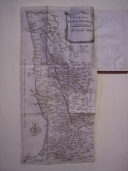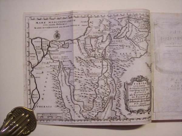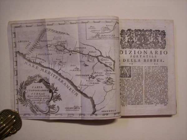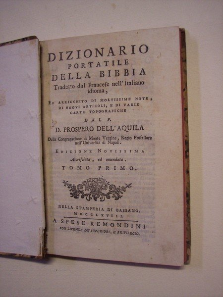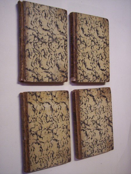 Edizione novissima accresciuta, ed emendata. <BR>4 tomi in 16° (cm. 18 x 12); pp. XXIV, 3 carte, 244 - XVI, 246, 2 n.n. - XXIV, 232 - XXXVI, 221, 7 n.n.; legatura coeva in mezza pelle con tassello e fregi oro al dorso, piatti marmorizzati e tagli rossi.<BR>Le carte raffigurano "Carta topographica Judeae, Quae complecitur ea loca tantum quorum mentio sit in Evangelio" (cm. 18 x 21), "Tabula itineris & stationum Israelitarum in deserto ab Eorum egressu ex Aegypto ad transitum jordanis delineata ab Authore" (cm. 18 x 21), Tabula terrae promisse" (cm. 46 x 21). <BR>Le ultime 7 pagine non numerate contengono tavole cronologiche delle sei età del mondo e tavola degli anni del regno dé Re dé Medi, e della Siria. <BR>Condizioni molto buone: segnaliamo lievi mende alle cuffie superiori e una piccola perdita alla cuffia inferiore del vol. II (restaurabile: il pezzo è conservato), piccolo danno alla parte inferiore della cerniera anteriore del vol. I; lievissime fioriture; lievi aloni agli angoli dei contropiatti, probabilmente tracce di vecchia colla di nastro adesivo che doveva aver trattenuto una copertina protettiva (una nota: la descrizione dei difetti li fa apparire maggiori di quel che non sono in realtà.)