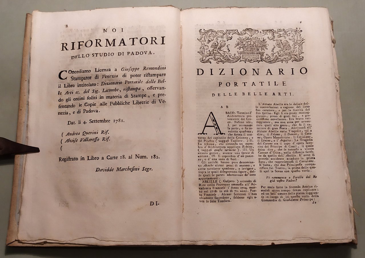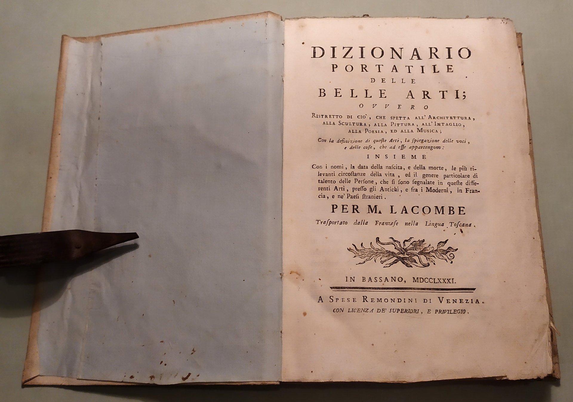 LACOMBE M. Dizionario portatile delle belle arti ovvero ristretto di cio' che spetta all'architettura, alla scultura, alla pittura, all'intaglio, alla poesia ed alla musica. In Bassano, Remondini, 1781. In 16mo; pp. 390. Testo su due colonne. Esemplare intonso. Cart. coevo, titolo calligrafato al dorso. Cicognara, 2163: "Opera utilissima agli artisti per la riunione di molte buone cognizioni".