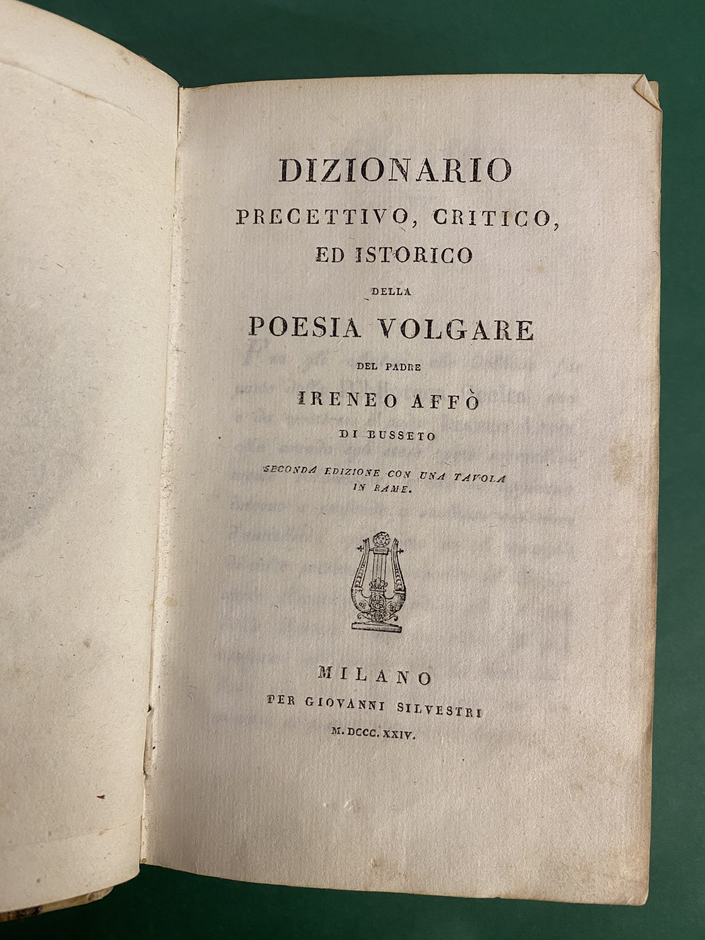 Dizionario precettivo, critico ed istorico della Poesia Volgare del Padre Ireneo Affò di Busseto seconda edizione con una tavola in rame
