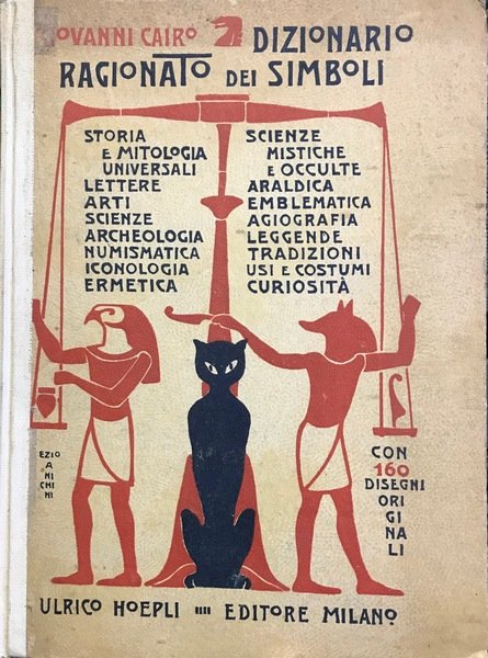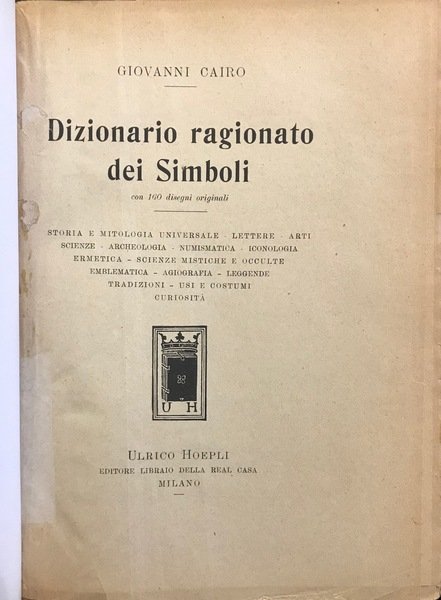 Ulrico Hoepli editore, 1930. Storia e mitologia universale - Lettere - Arti - Scienze - Archeologia - Numismatica - Iconologia - Ermetica - Scienze mistiche e occulte - Emblematica - Agiografia - Leggende - Tradizioni - Usi e costumi - Curiositˆ. Prima edizione (1930 circa), legatura in cartonato illustrato da Ezio Anichini (dorso in tela non originale), con 160 disegni originali nel testo