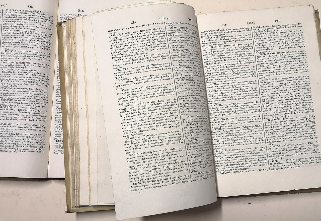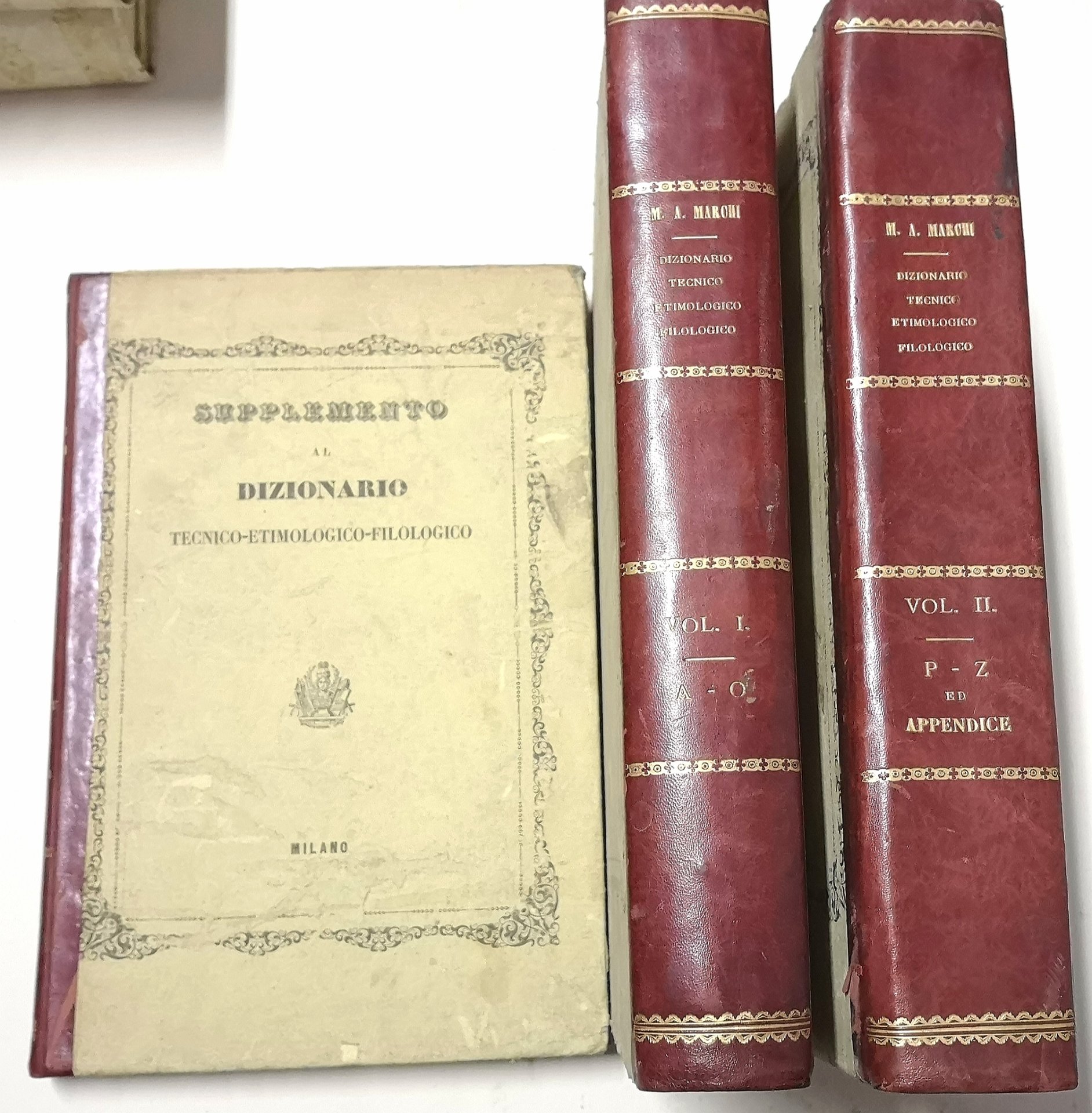 >3 vol. in-4, pp. XXIV, 620; 748; (6), 302; leg. coeva in m. pelle, titolo e fregi in oro al dorso, piatti in cart. edit. originale, in antiporta al primo volume ritratto dell'Autore protetto da velina; vignette in xilogr. ai frontespizi. Ponderosa opera che ha ''per iscopo di rendere la ragione delle voci Greche usate nel linguaggio scientifico e letterario'', arricchita da un'estesa bibliografia. Esemplare assai bello e fresco.