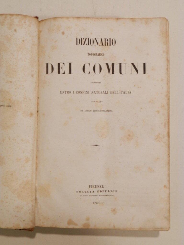 8°, cm 22, pp. (8), 1070; legatura ottocentesca in mezza pelle con titolo al dorso, normali fioriture alle carte interne, segni del tempo alla legatura, abrasioni ai piatti e sbiaditure al dorso, peraltro buona copia. Censisce più di 10.700 comuni italiani. Primo dizionario del nascente stato italiano. Edizione originale.. *** TUTTI I NOSTRI LIBRI SONO VISIBILI PREVIO CONTATTO MAIL O TELEFONO NELLA NUOVA SEDE DI MILANO: LIBRERIA COSMOPOLIS, VIA JOMMELLI, 22. ***