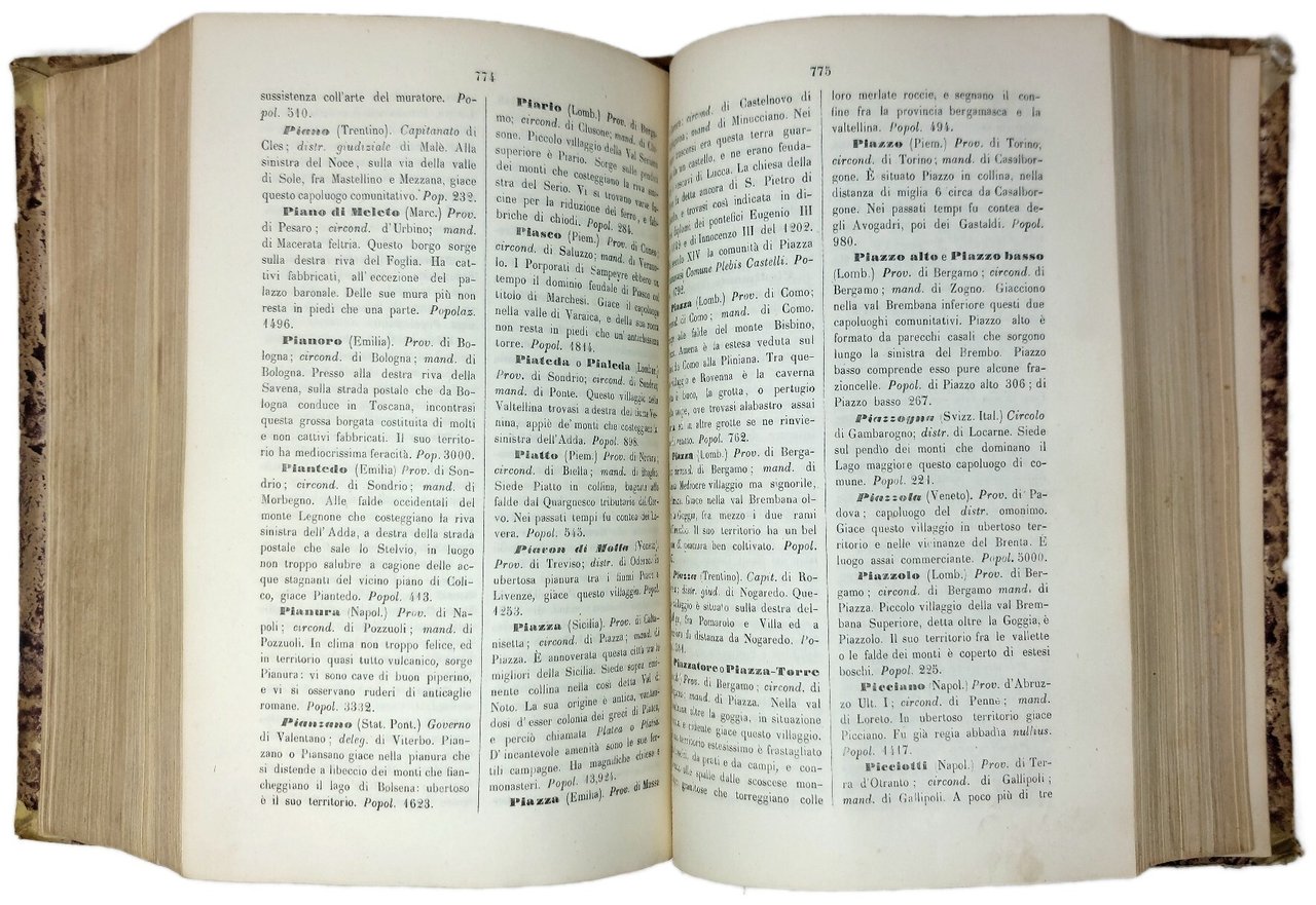 >in-8 grande, pp. (8), 1070, 184 (''Prospetto della Divisione Territoriale del Regno d'Italia per provincie, circondari, mandamenti e comuni, nel MDCCCLXIII''). Legatura del tempo in mezza pelle, titolo e fregi oro al dorso. Vasto e completo dizionario dei Comuni d'Italia, con brevi notizie storico-statistiche di ognuno di essi. E' un sunto della vasta opera del medesimo autore pubblicata a Firenze nel 1835-45 in 24 volumi, la più estesa galleria topografica illustrata dell'Italia. Il presente volume offre notizie storiche aggiornate ed è di rapida e precisa consultazione. Bell'esemplare, non comune.