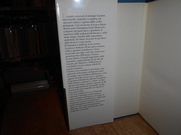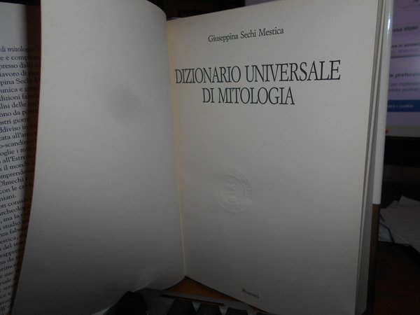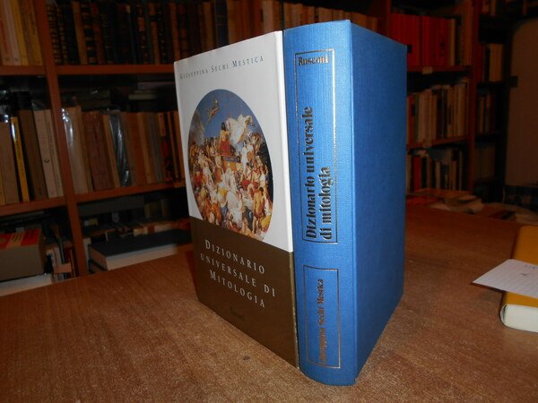 GIUSEPPINA SECHI MESTICA. Milano, Rusconi Editore, 1990. Dizionario Universale di Mitologia. In-8°, tela edit. bleu con titolo in oro al dorso, sovracopertina ill. a col. 415, (1) pp. In ottimo stato di conservazione. Uff. stanzetta TV. mob. a destra.