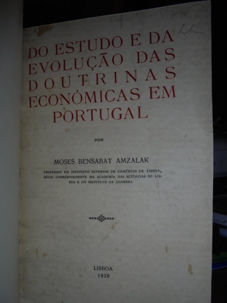 Moses Bansabat Amzalak. Editora, Lisboa, 1928. Do Estudo e da evolução das doutrinas economicas em Portugal. In-16°, tela con titolo in oro entro tassello al dorso. Le copertine originali sono conservate. 277 pp. Rara prima edizione in ottimo stato di conservazione con alcune sottolineature a matita colorata. Lett. mod. mob. H